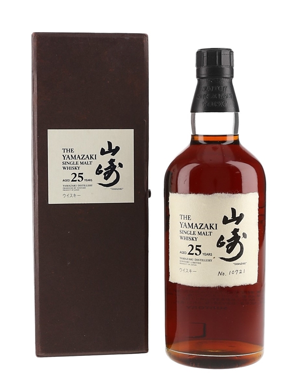A bottle of The Yamazaki 25 Year Old Single Malt Whisky from Japan, matured in sherry casks. This is bottle number 10721.
