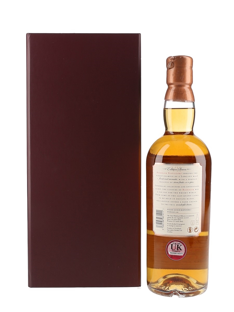 A bottle of Rosebank 21 Year Old Single Malt Scotch Whisky, bottled by Speciality Drinks Ltd. This release, Enchantment, is the seventh edition in the Rosebank Roses series.