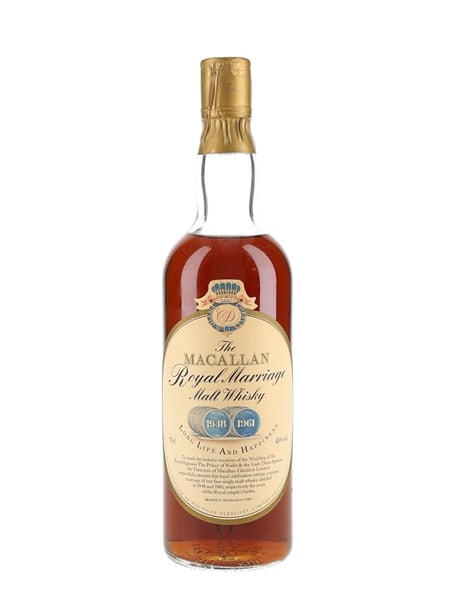 A bottle of The Macallan Royal Marriage Malt Whisky.