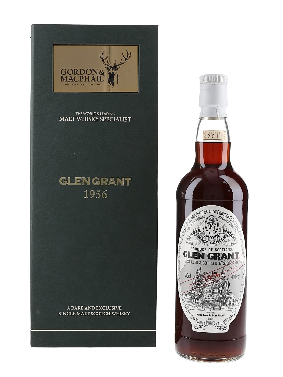 A bottle of Glen Grant Speyside Scotch Single Malt Whisky. This was distilled on 13 December 1956, aged in a First Fill Sherry Butt Cask, and bottled on 1 August 2011 by independent bottler Gordon & MacPhail.