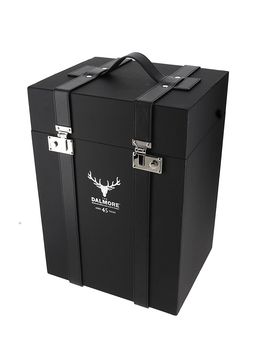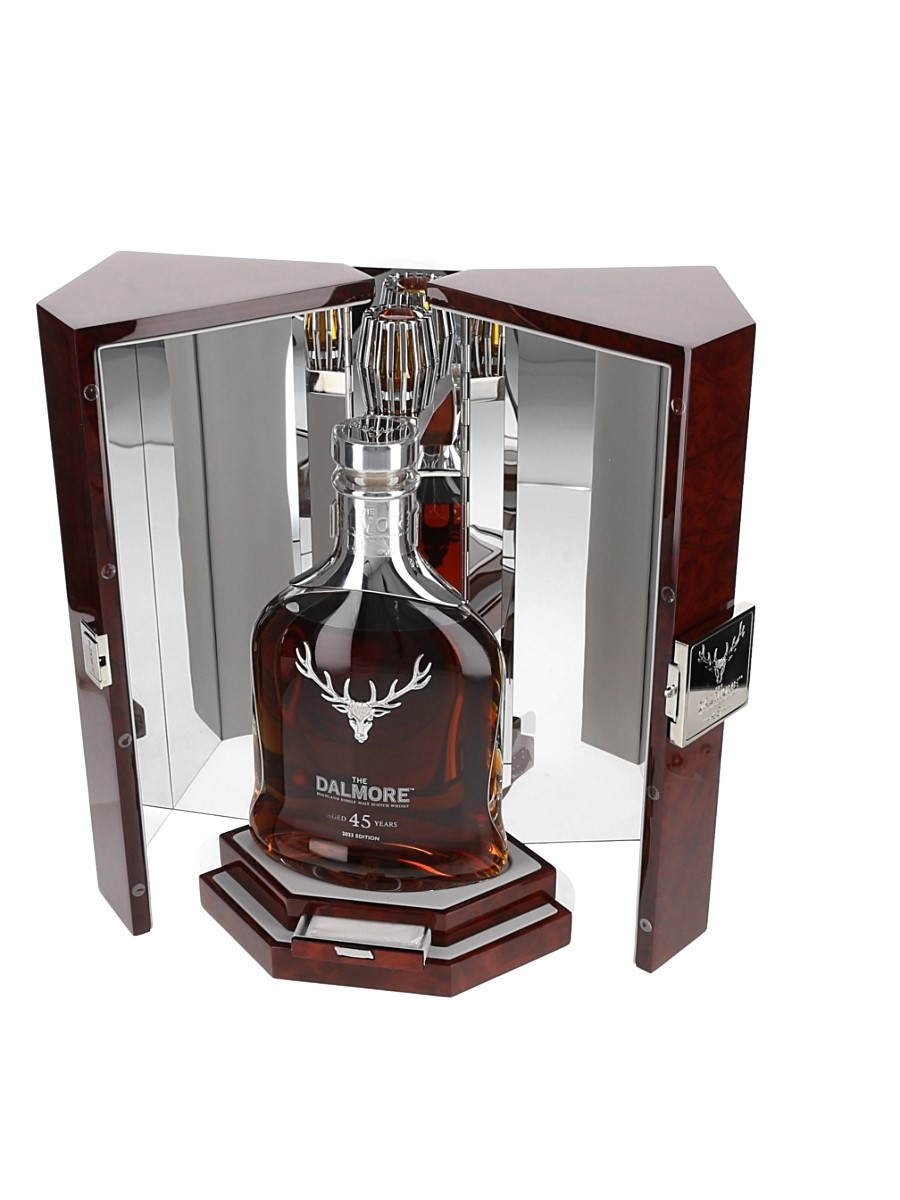 A bottle of The Dalmore 45 Year Old Highland Single Malt Scotch Whisky presented in a Baccarat crystal decanter with a stopper. This was released in 2023 and contains spirit matured in bourbon, Cabernet Sauvignon and tawny port casks, blended by Richard Paterson.