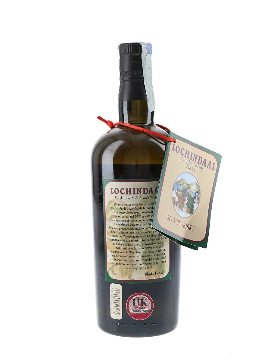 A bottle of Lochindaal Single Malt Scotch Whisky, distilled in 2009 at Bruichladdich distillery and bottled in 2016 by High Spirit.