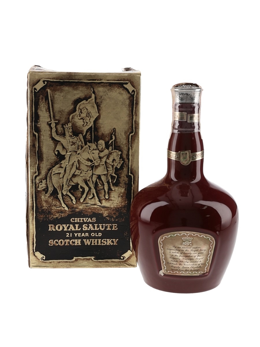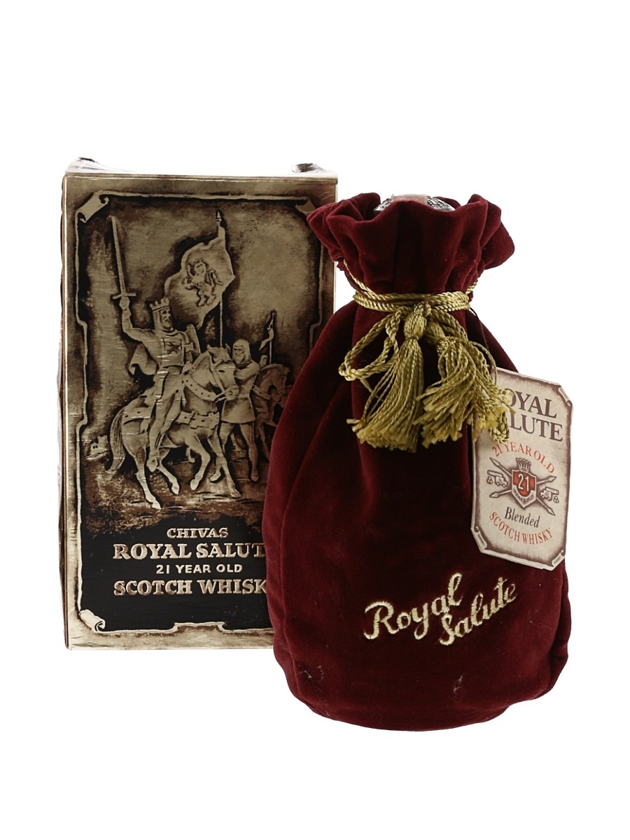 A bottle of Chivas Brothers' Royal Salute 21 Year Old Blended Scotch Whisky, The Ruby Flagon, produced by Chivas Brothers Limited and presented in a porcelain decanter in a velvet bag. We estimate this was bottled in the 1990s.