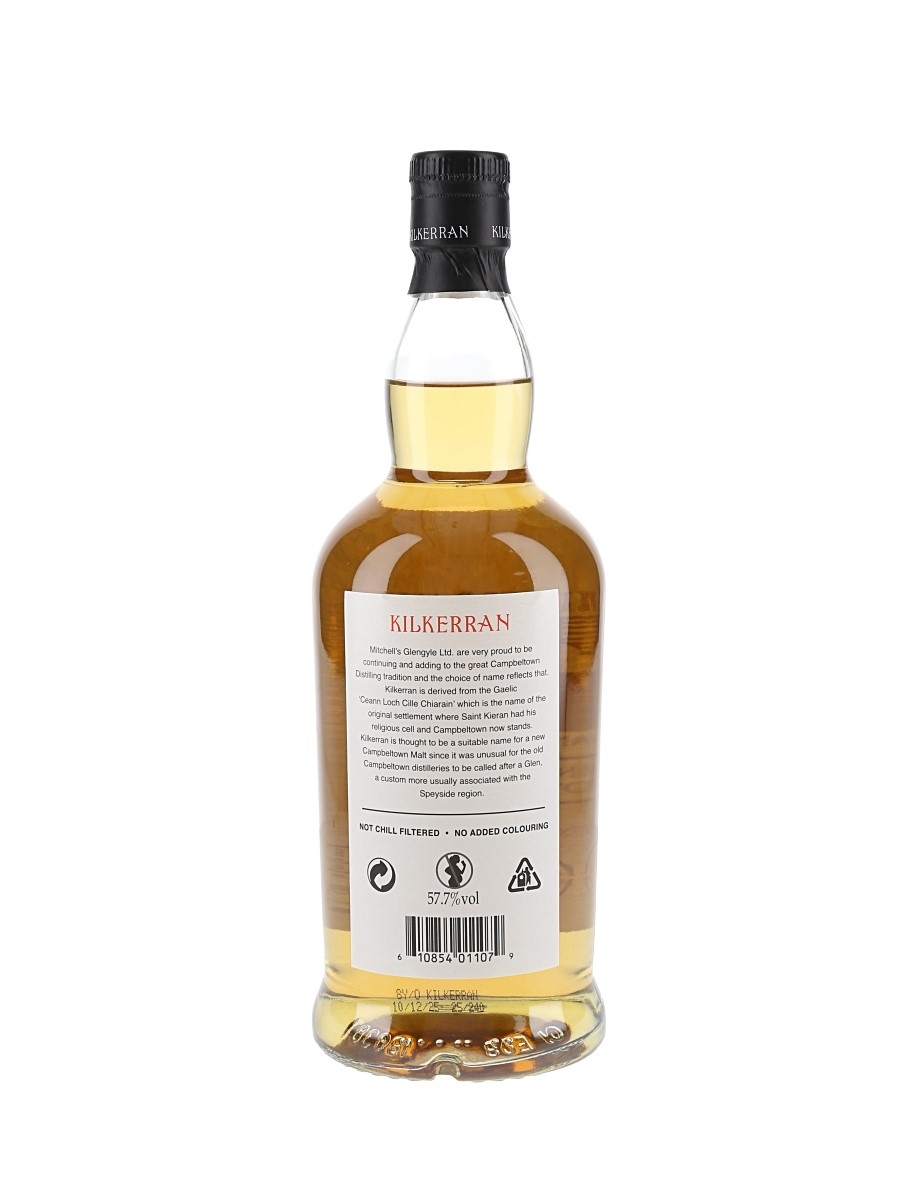 A bottle of Kilkerran 8 Year Old Cask Strength Bourbon Cask Matured Campbeltown Single Malt Scotch Whisky, distilled by Mitchell's Glengyle Ltd. and bottled at 57.7% ABV. The bottling code indicates this was bottled on 10 December 2025.