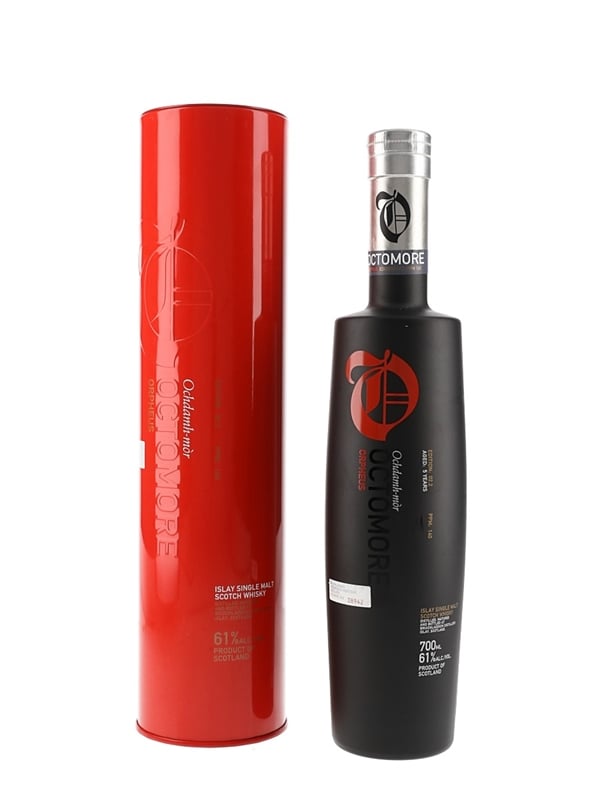 A bottle of Octomore Orpheus 5 Year Old Islay Single Malt Scotch Whisky. This has spent time in casks from Château Pétrus, the prestigious Bordeaux estate. The bottling code indicates this was bottled on 3 December 2009.