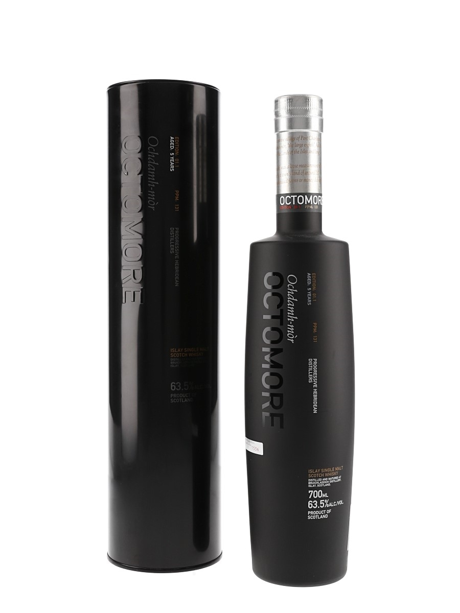 A bottle of Octomore 5 Year Old Islay Single Malt Scotch Whisky. This is the first edition, number 01.1, distilled in 2002, aged in bourbon barrels, and bottled in 2008.