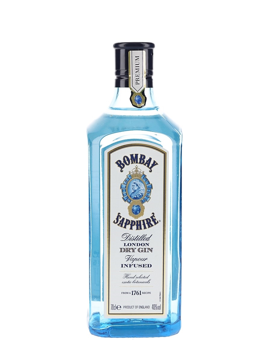 A bottle of Bombay Sapphire Distilled London Dry Gin. This was made from neutral grain spirit to a 1761 recipe, with a blend of ten carefully selected botanical ingredients.