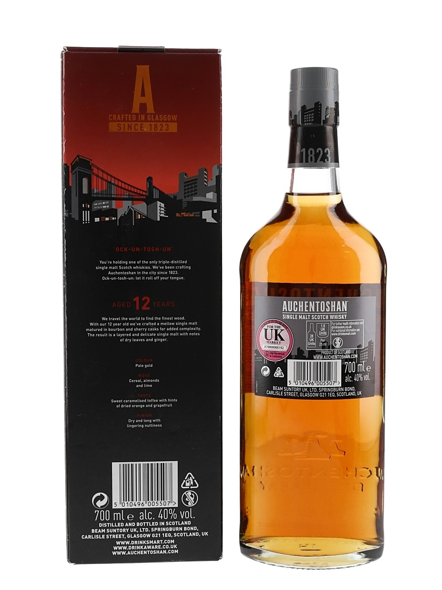 A bottle of Auchentoshan 12 Year Old Lowland Single Malt Scotch Whisky. This was triple distilled, and then matured in bourbon and sherry casks.