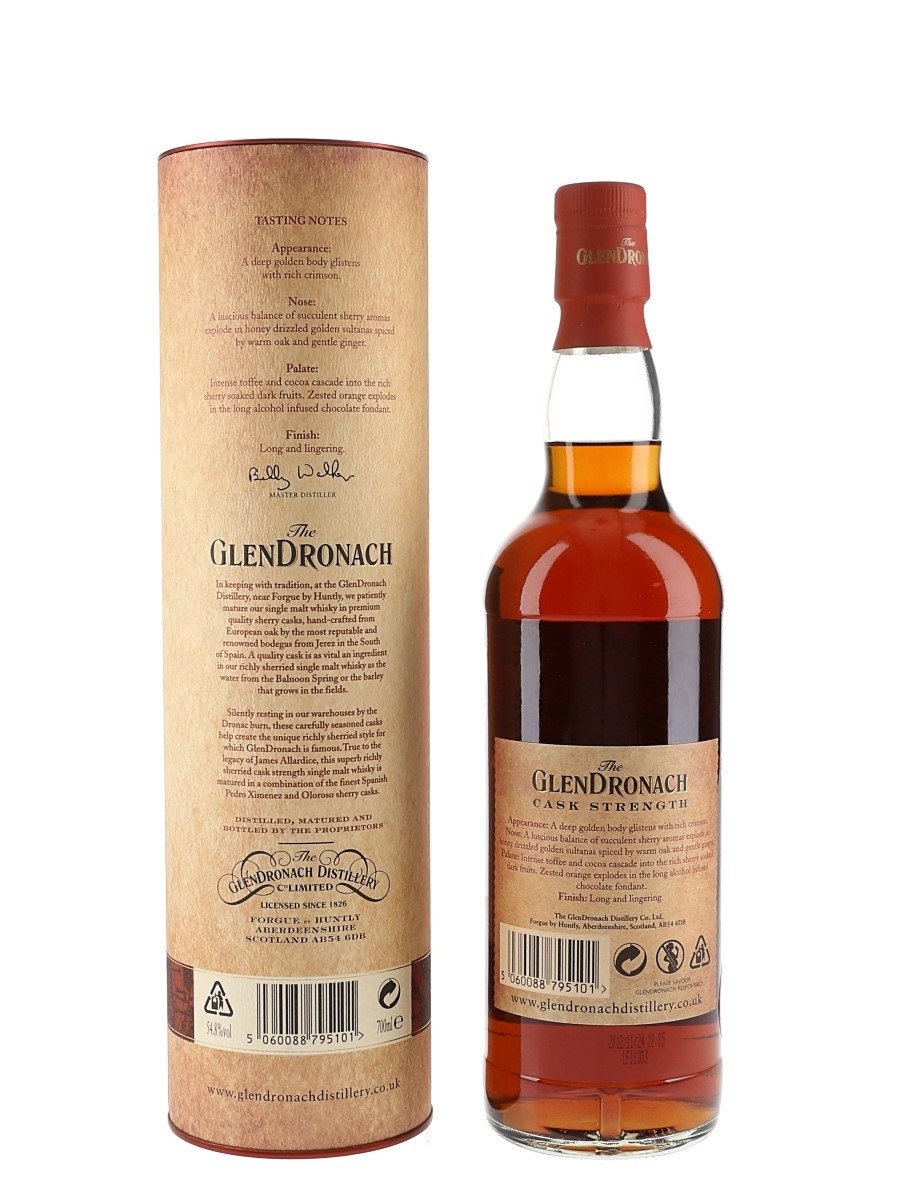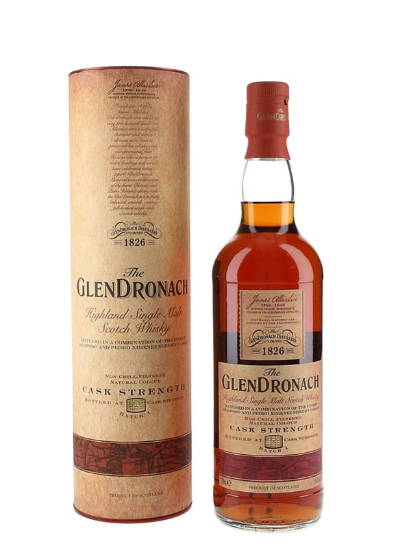 A bottle of The Glendronach Cask Strength Batch 1. This was matured in a combination of oloroso and Pedro Ximénez sherry casks and bottled at 54.8% ABV.