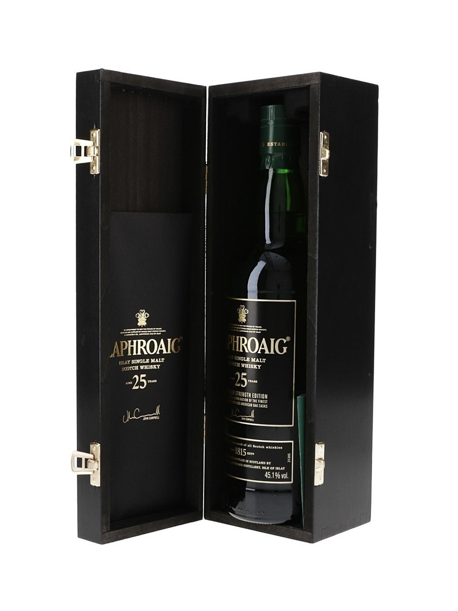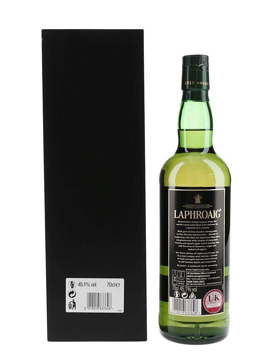 A bottle of Laphroaig 25 Year Old Islay Single Malt Scotch whisky. This was matured in a combination of oloroso sherry and American oak casks and bottled at cask strength in 2014.