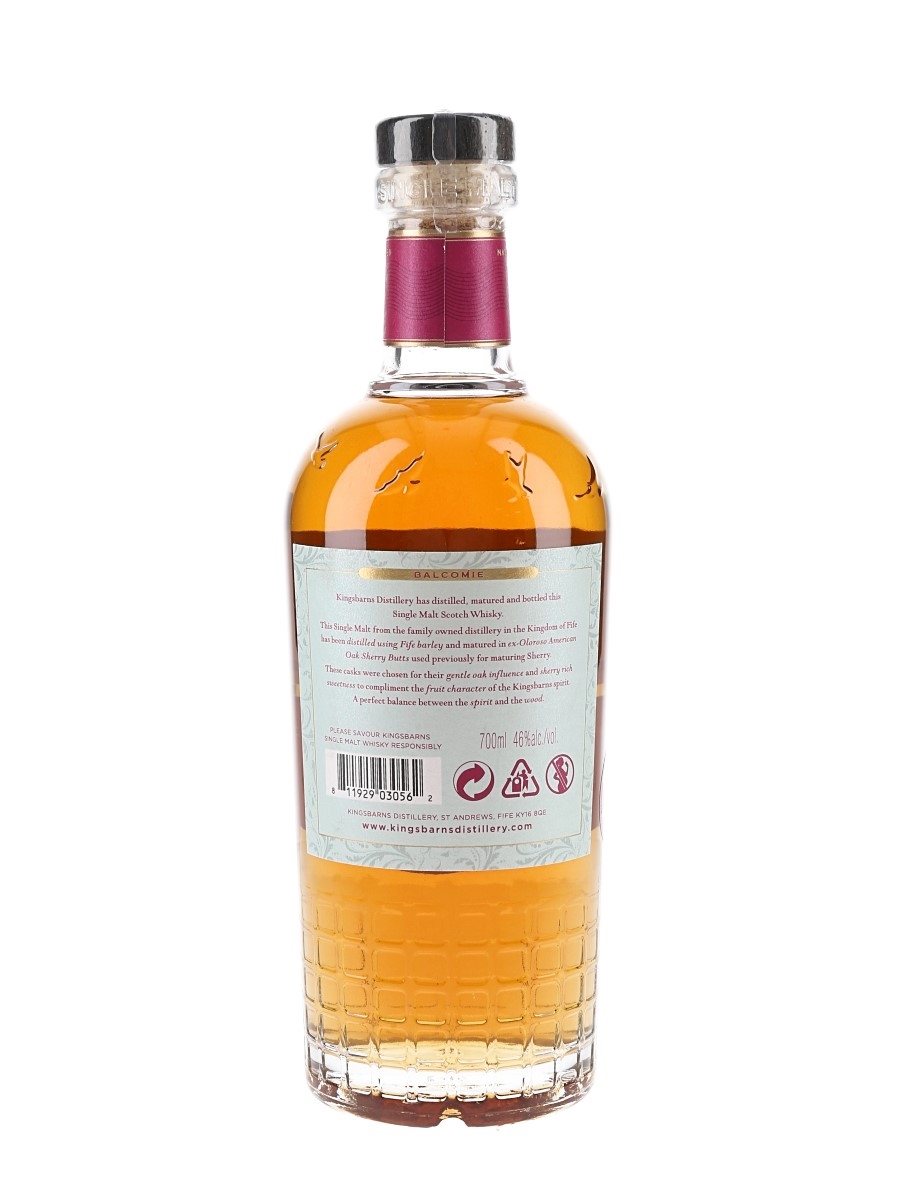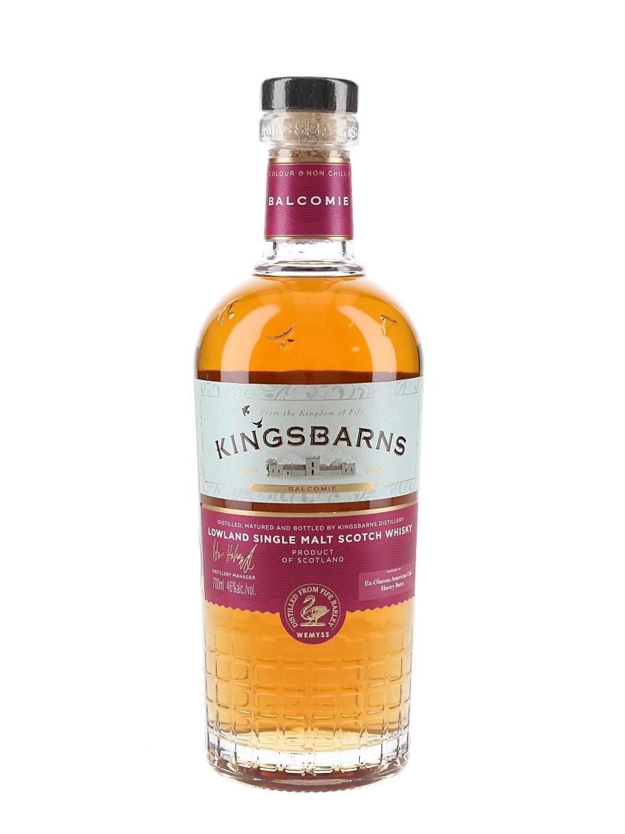 A bottle of Kingsbarns Balcomie Lowland Single Malt Scotch Whisky, matured in ex-Oloroso American oak sherry butts. The bottling code indicates this was bottled on 1 September 2023.