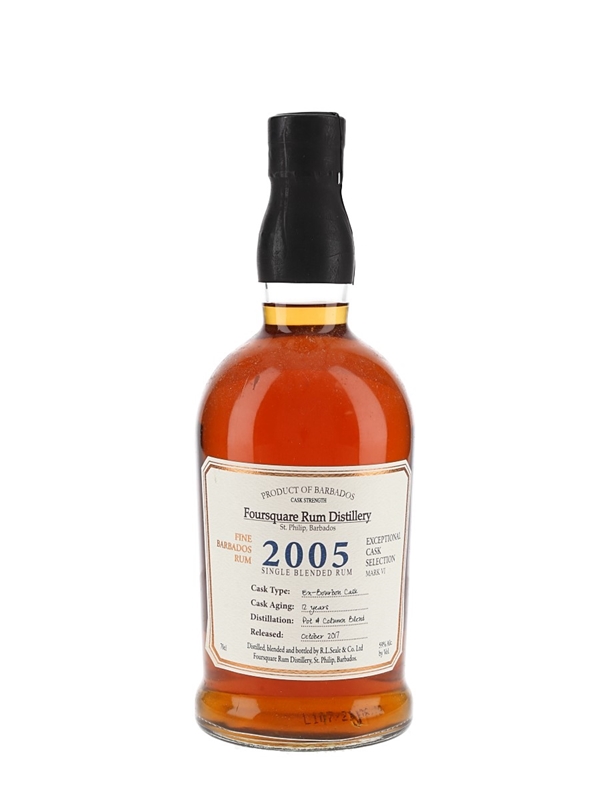 A bottle of Foursquare 2005 Single Blended Rum from Barbados. This is a blend from the artisanal pot distillation and traditional twin column continuous distillation, matured in ex-bourbon casks for 12 years and released in October 2017 as part of the Exceptional Cask Selection series.