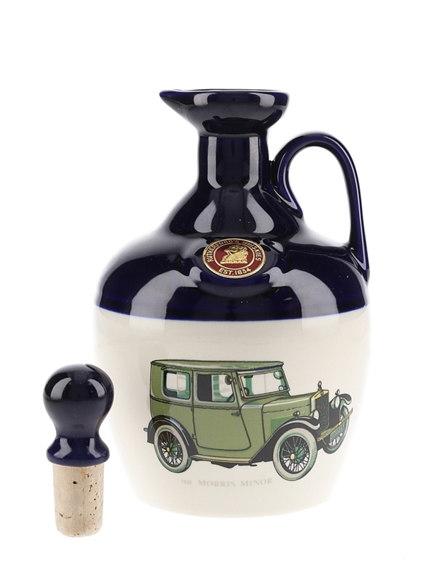 A bottle of Rutherford's blended Malt Scotch whisky in a ceramic decanter featuring a Morris Minor 1926.