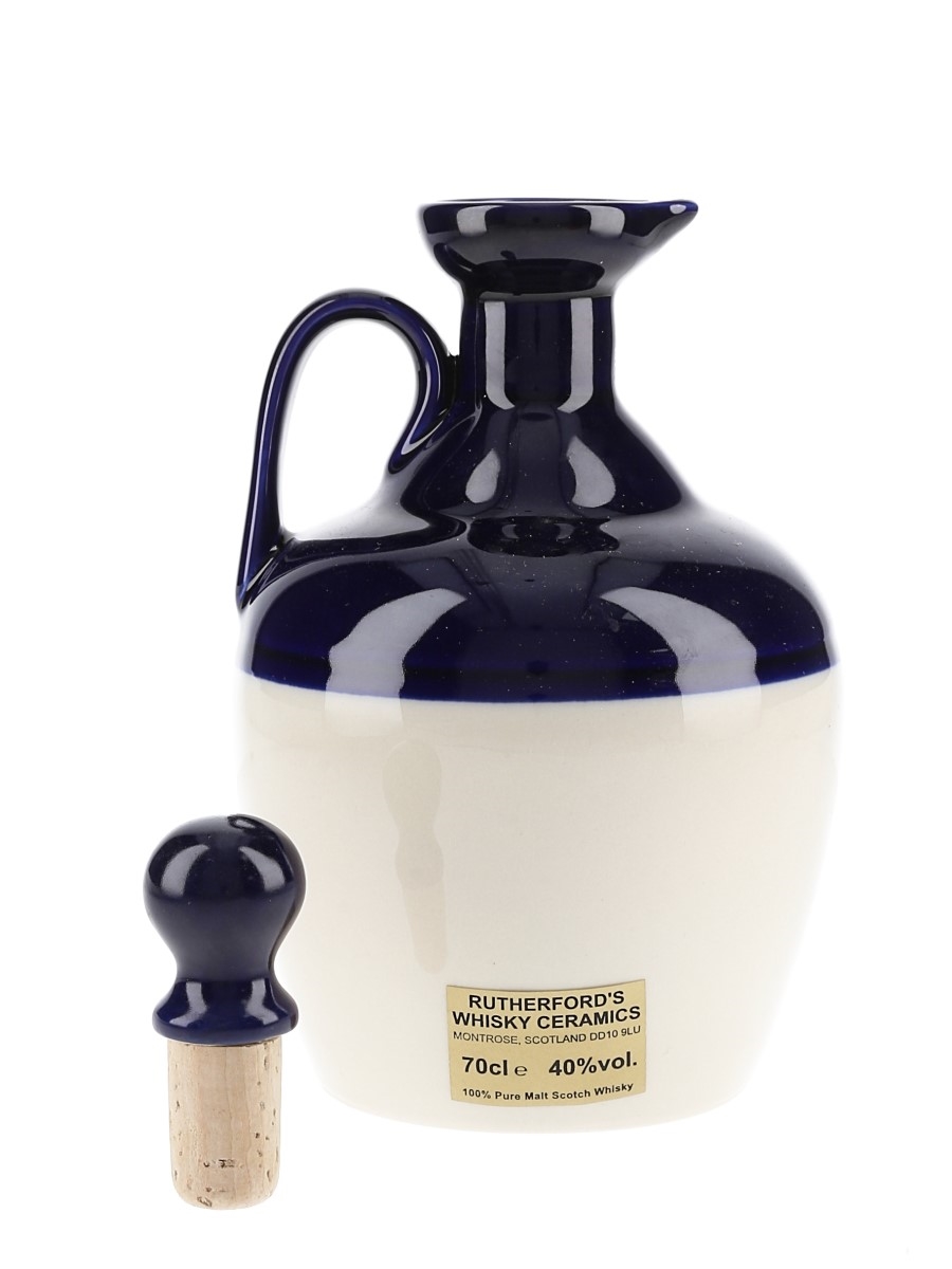 A bottle of Rutherford's blended Malt Scotch whisky in a ceramic decanter featuring a Rover Eight 1926.