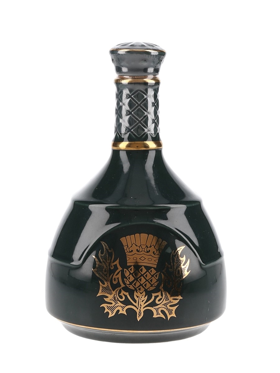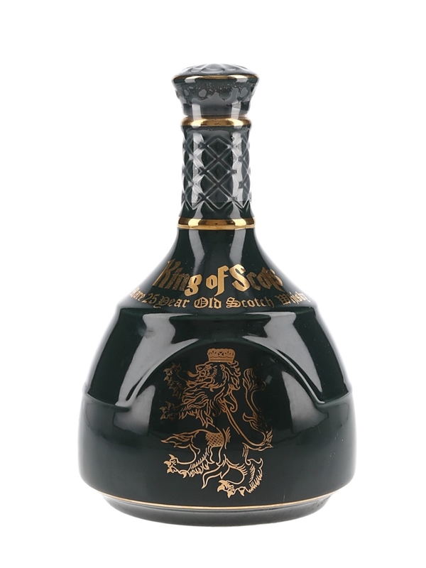 A bottle of King of Scots 25 Year Old Scotch Whisky presented in a ceramic decanter.
