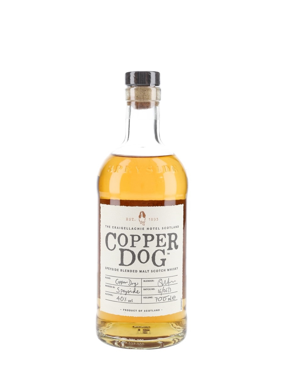 A bottle of Copper Dog Speyside Blended Malt Scotch Whisky, composed of no fewer than eight single malts married together in cask in Speyside.