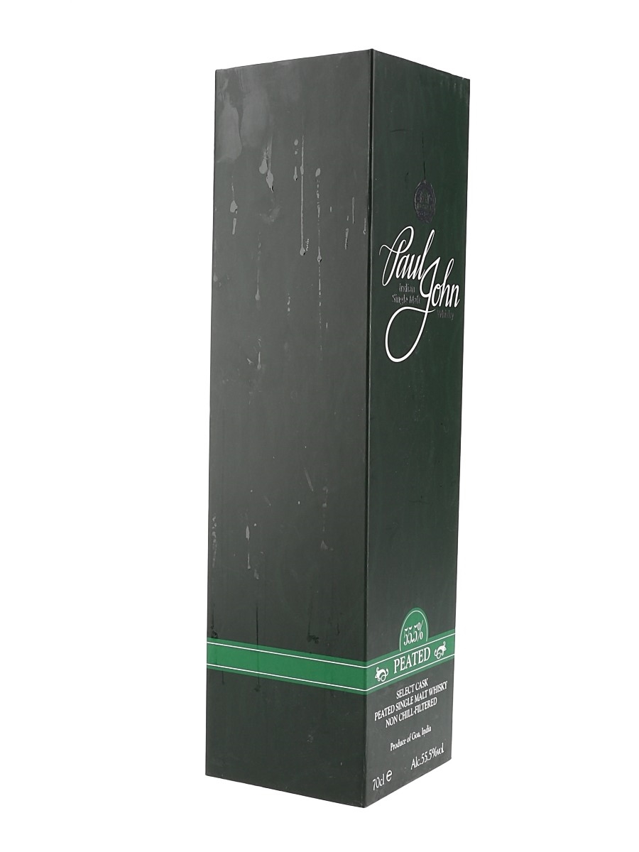 A bottle of Paul John Peated Select Cask single malt whisky from India. This was distilled at John Distilleries, Goa, matured in American white oak bourbon barrels, and bottled at cask strength.