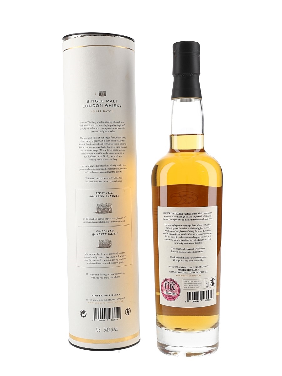 A bottle of Bimber Small Batch Single Malt London Whisky, matured in a combination of first fill bourbon barrels and quarter casks that previously held heavily peated Islay whisky. This was bottled on 30 July 2020.