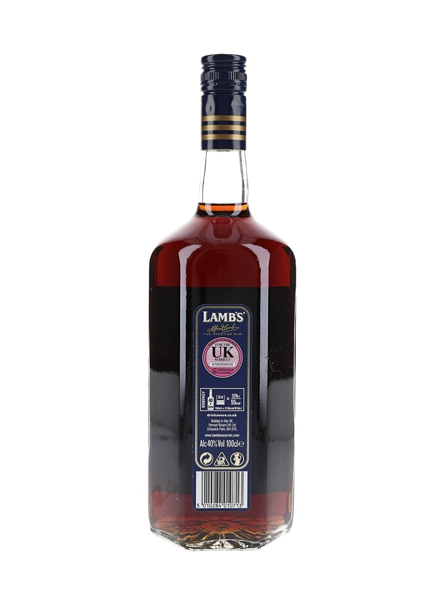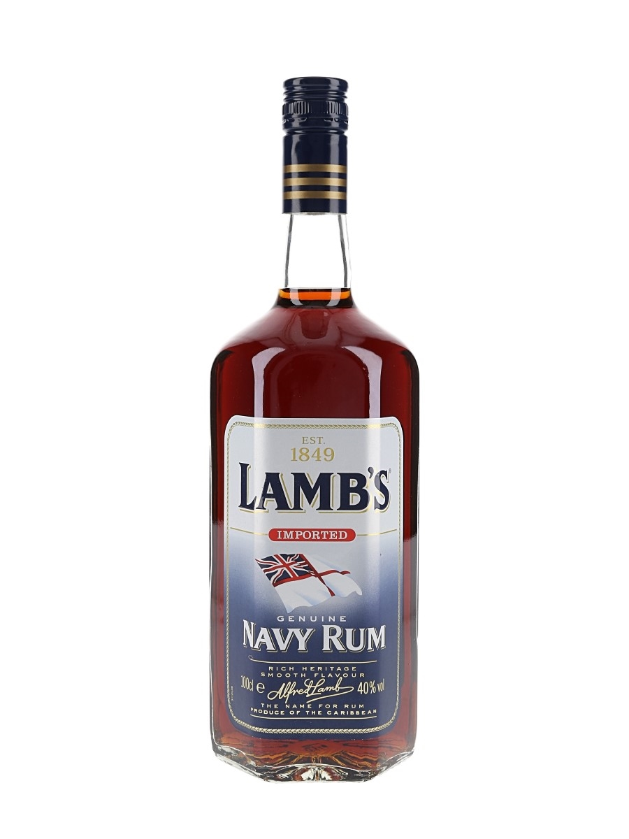 A litre bottle of Lamb's Navy Rum, blended and bottled by United Rum Merchants from rum produced in Barbados, Guyana, Jamaica and Trinidad.