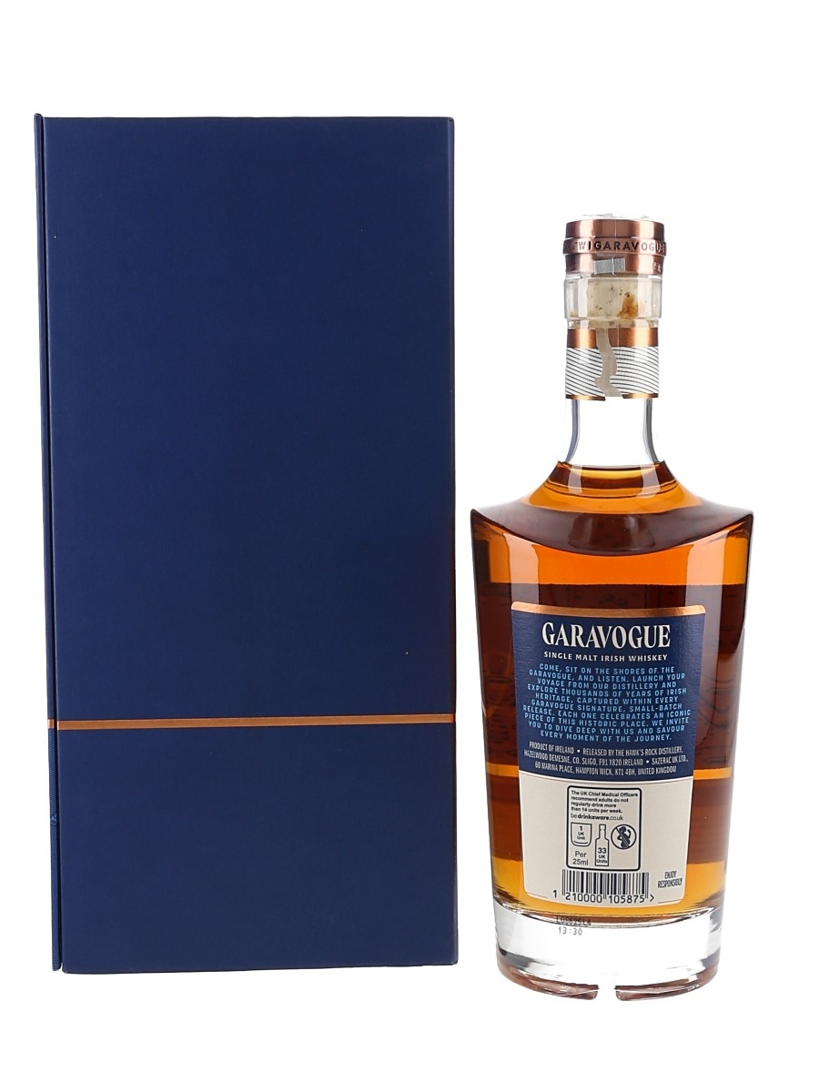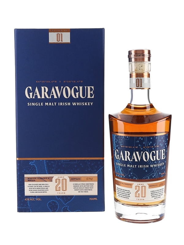 A bottle of Garavogue 20 Year Old Single Malt Irish Whiskey, produced by Hawk's Rock Disillery. This was matured for 14 years in ex-bourbon casks before finishing in Muscat, Sauternes, Pedro Ximenez and rum casks.