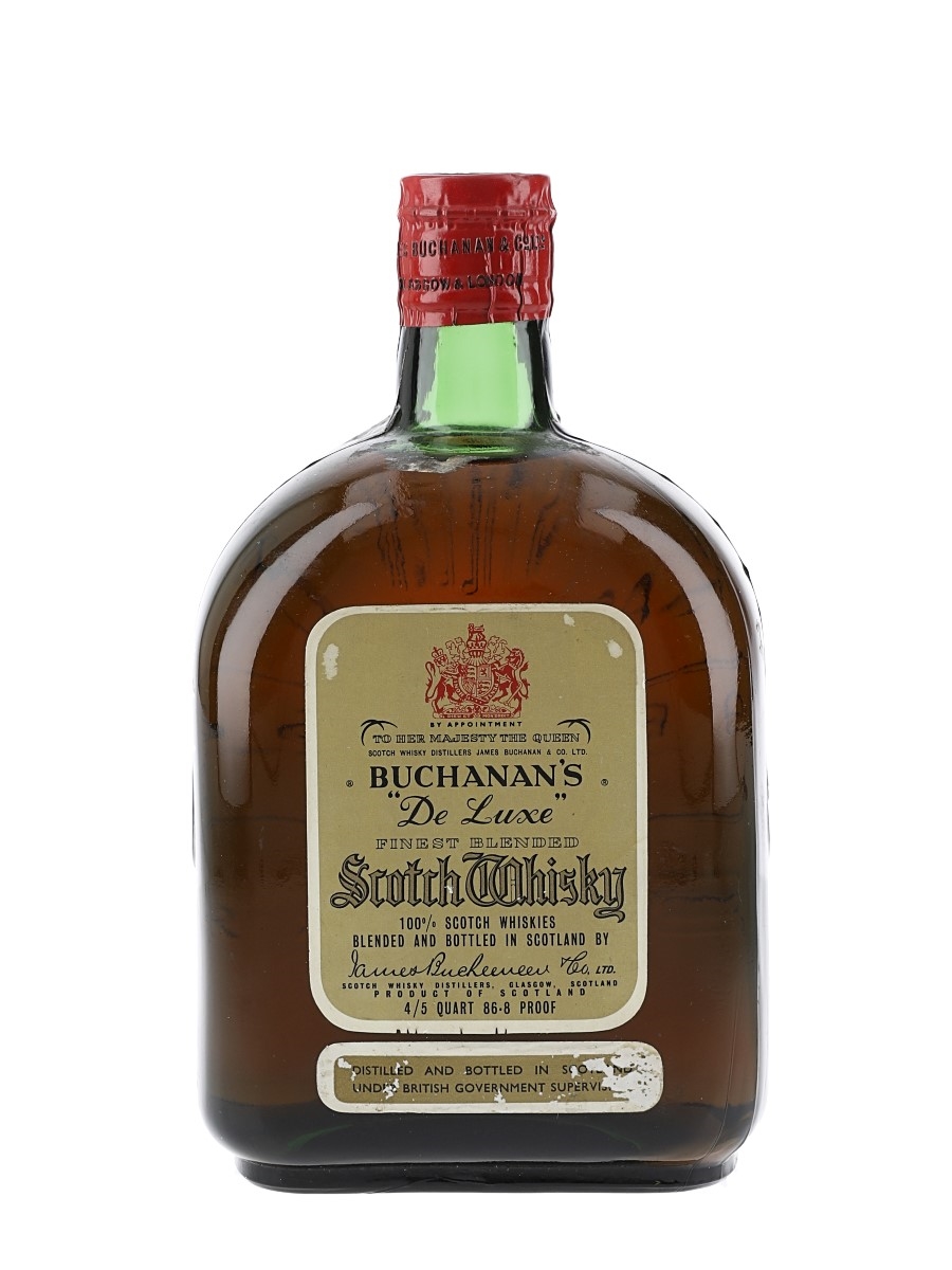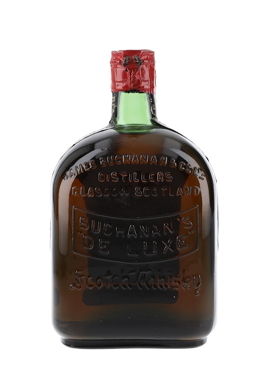 A bottle of Buchanan's De Luxe Finest Blended Scotch Whisky, sealed with a spring cap closure. This was distilled, blended and bottled by the proprietors of Black & White Scotch Whisky, James Buchanan & Co. Limited. We estimate this was bottled in the 1950s to 1960s.
