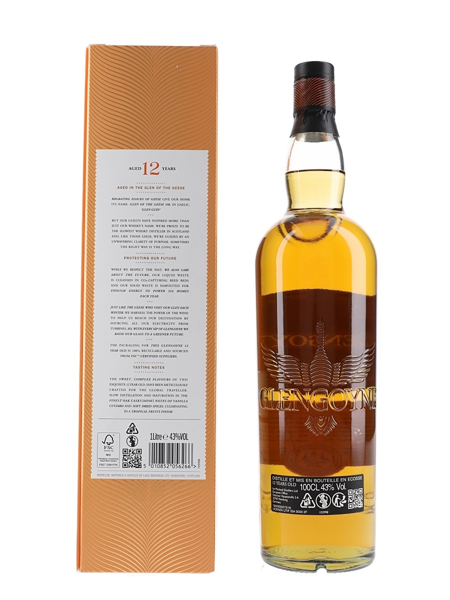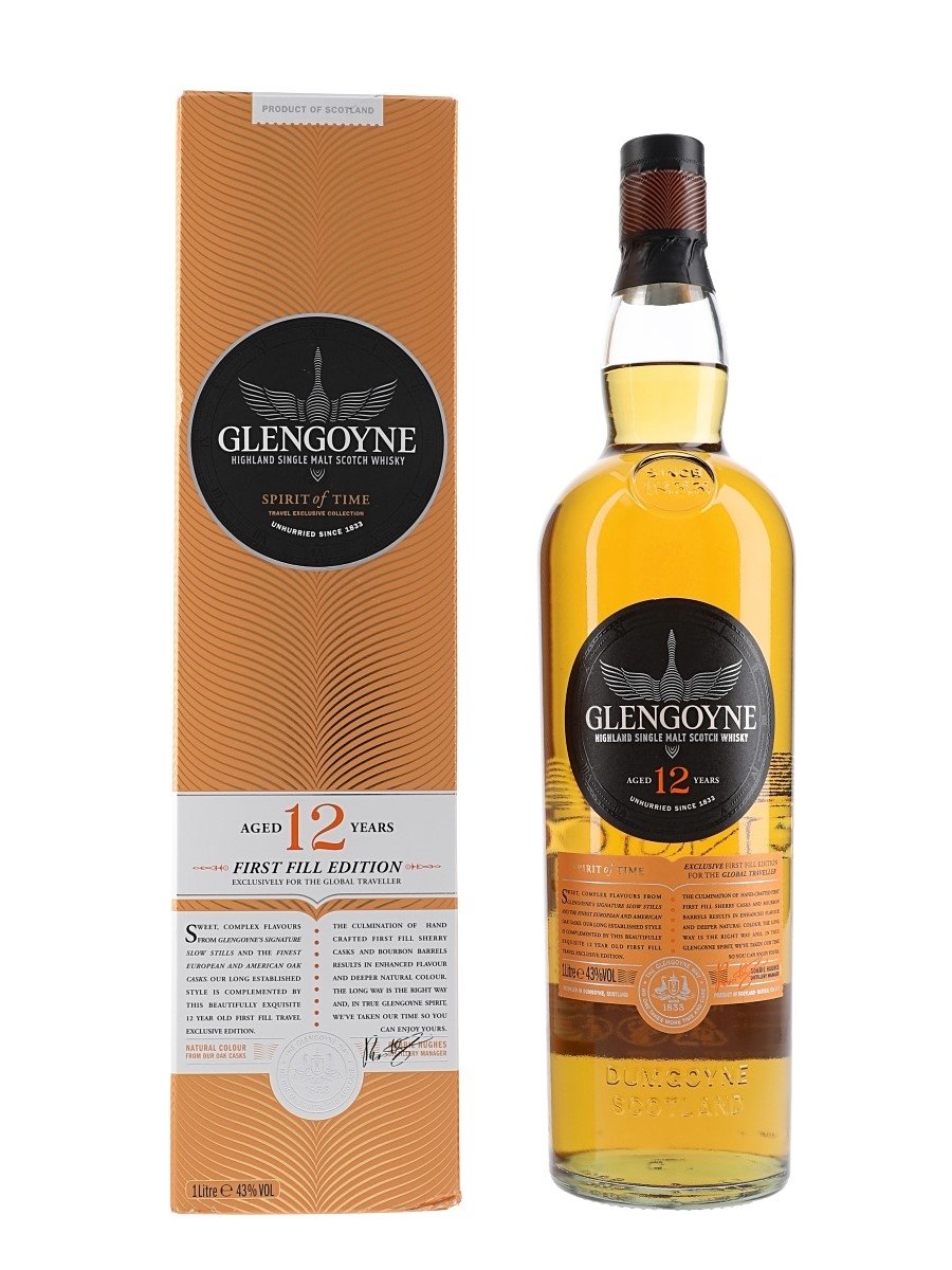 A litre bottle of Glengoyne 12 Year Old Spirit of Time Single Highland Malt Scotch Whisky. This is part of the First Fill Edition series, bottled exclusively for the Global Travel retail. The bottling code indicates this was bottled on 30 May 2025