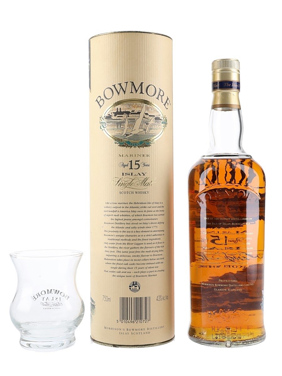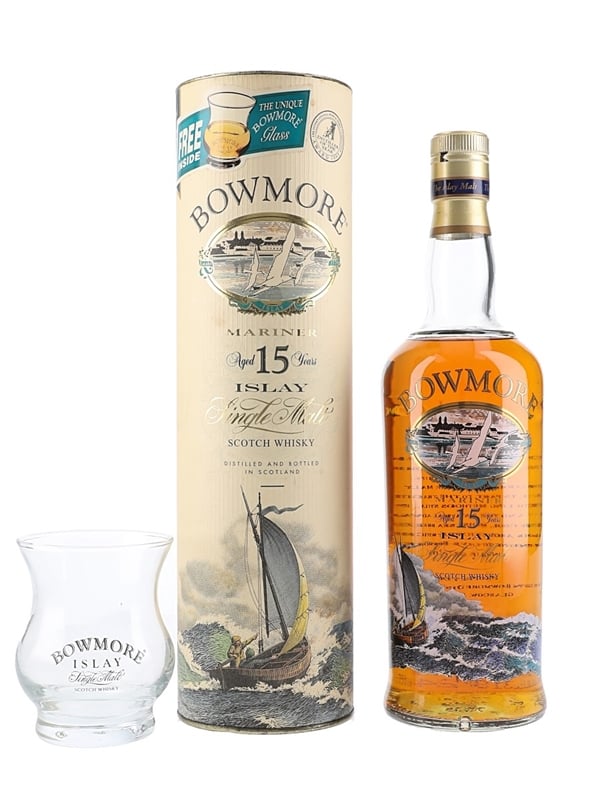 A bottle of Bowmore 15 Year Old Mariner Single Malt Scotch Whisky with a screen printed label and branded tasting glass. We estimate this was bottled in the 1990s.