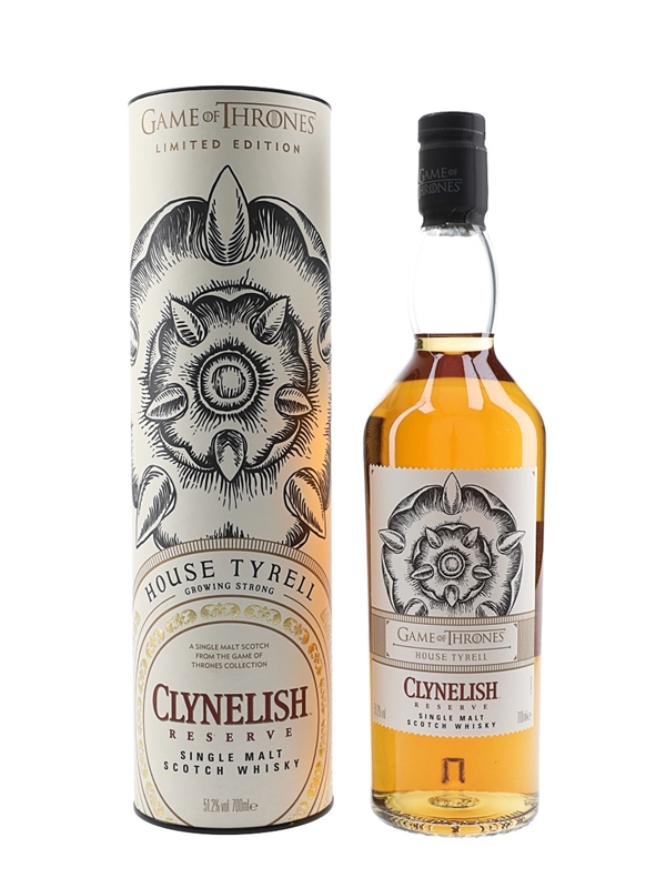 A limited edition bottle of Clynelish Reserve from Diageo's Game of Thrones series. Each of the eight bottles in the series is named for one of the Great Houses of Westeros and The Night's Watch. This edition represents House Tyrell.