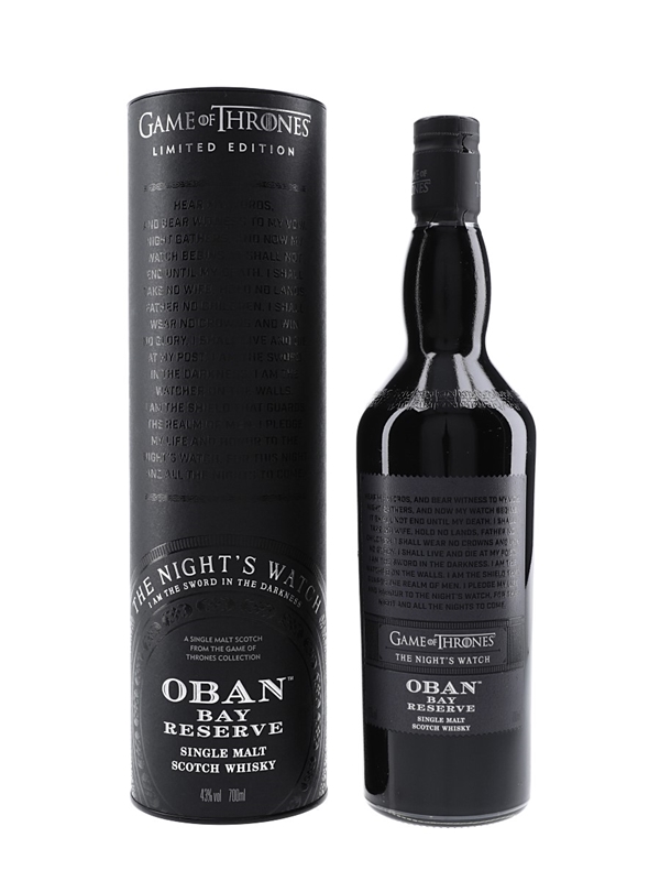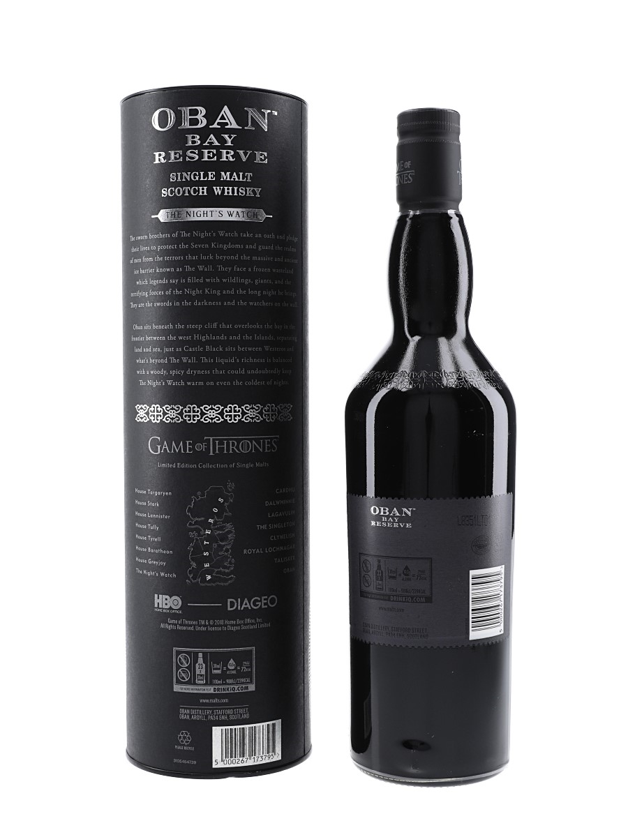 A limited edition bottle of Oban Bay Reserve from Diageo's Game of Thrones series. Each of the eight bottles in the series is named for one of the Great Houses of Westeros and The Night's Watch. This edition represents The Night's Watch.