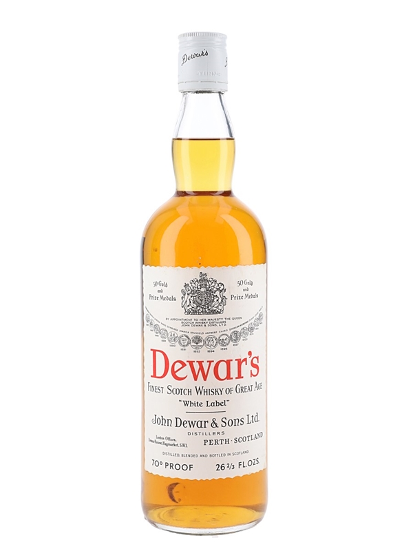 A bottle of Dewar's White Label Fine Scotch Whisky produced by John Dewar & Sons Ltd. We estimate this was bottled in the 1970s.