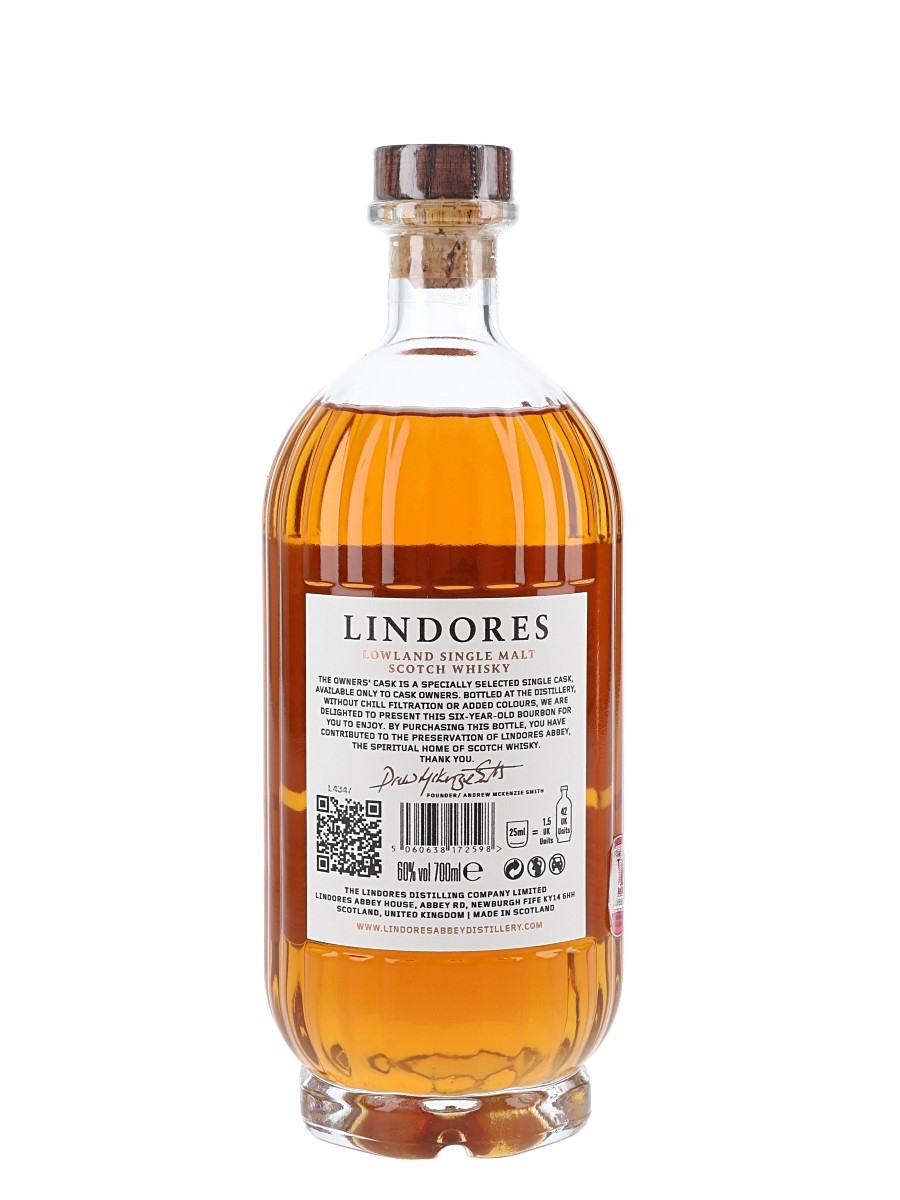 A bottle of Lindores Abbey 6 Year Old Owners Casks Lowland Single Malt Scotch Whisky. This was distilled on 6 December 2018, matured in a single Woodford Reserve Bourbon cask and bottled on 12 December 2024 at 60% ABV.