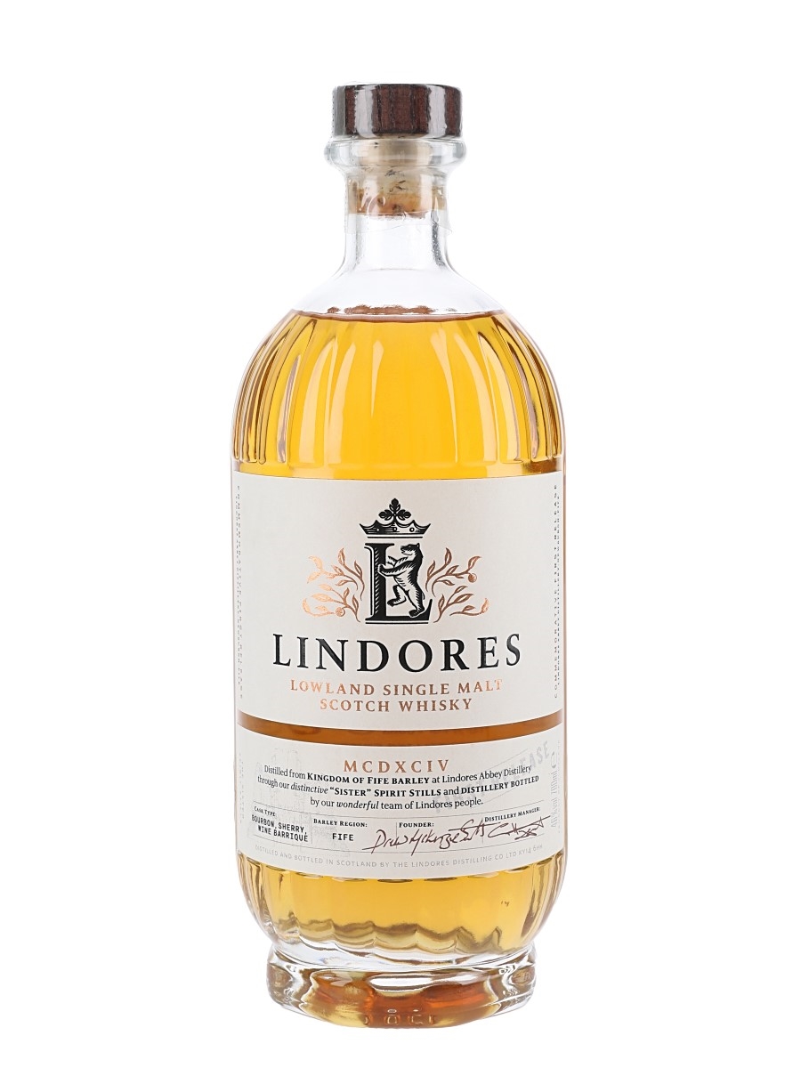 A bottle of Lindores Abbey MCDXCIV Lowland Single Malt Scotch Whisky, commemorative first release bottled at 46% ABV. From the site of the first recorded distillation of Scotch whisky in 1494, this is the inaugural whisky from Lindores Abbey distillery and was matured in bourbon, sherry and wine barriques.