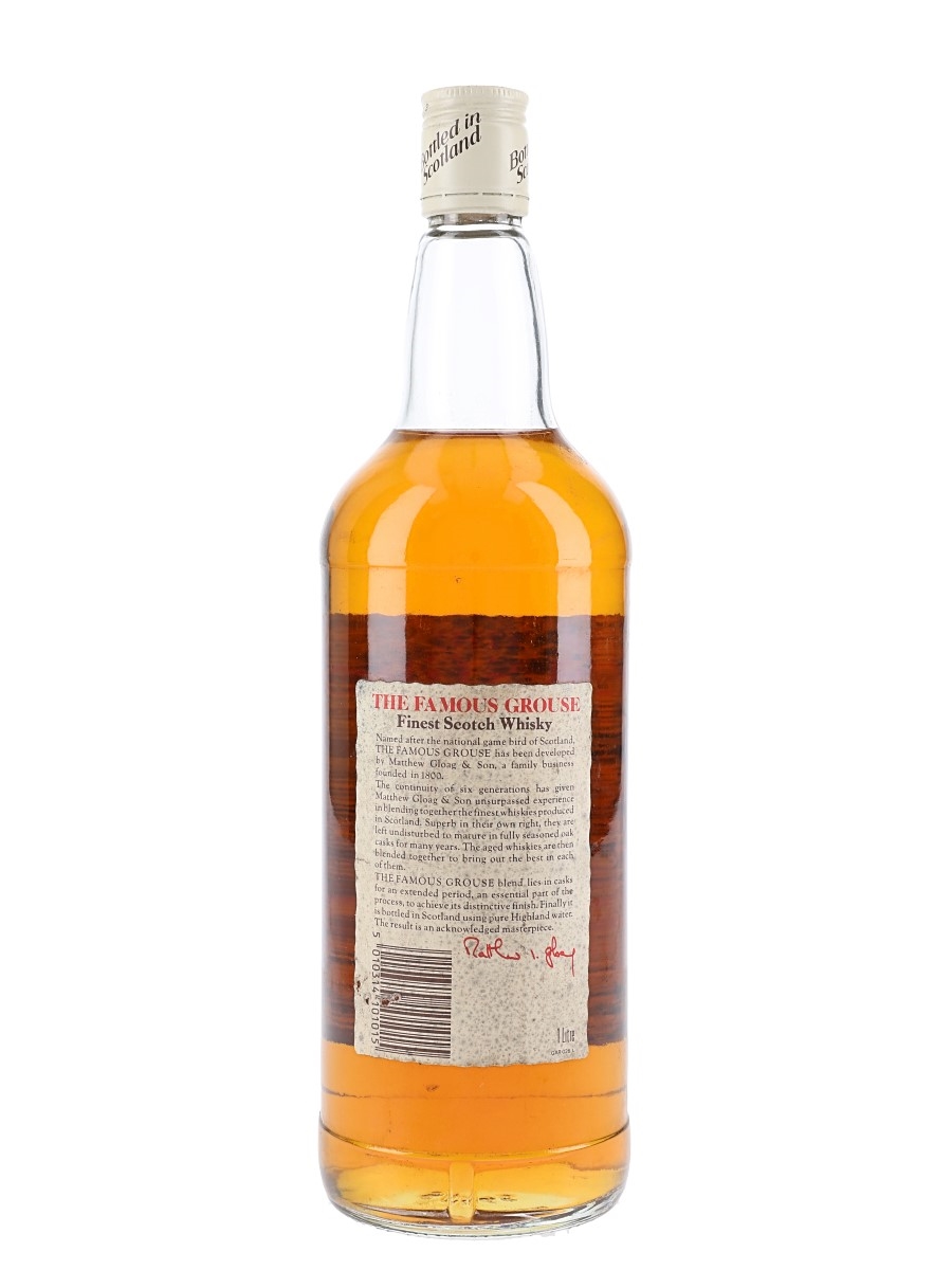 A litre bottle of The Famous Grouse, bottled by Matthew Gloag & Son Ltd. We estimate this was bottled in the 1980s.