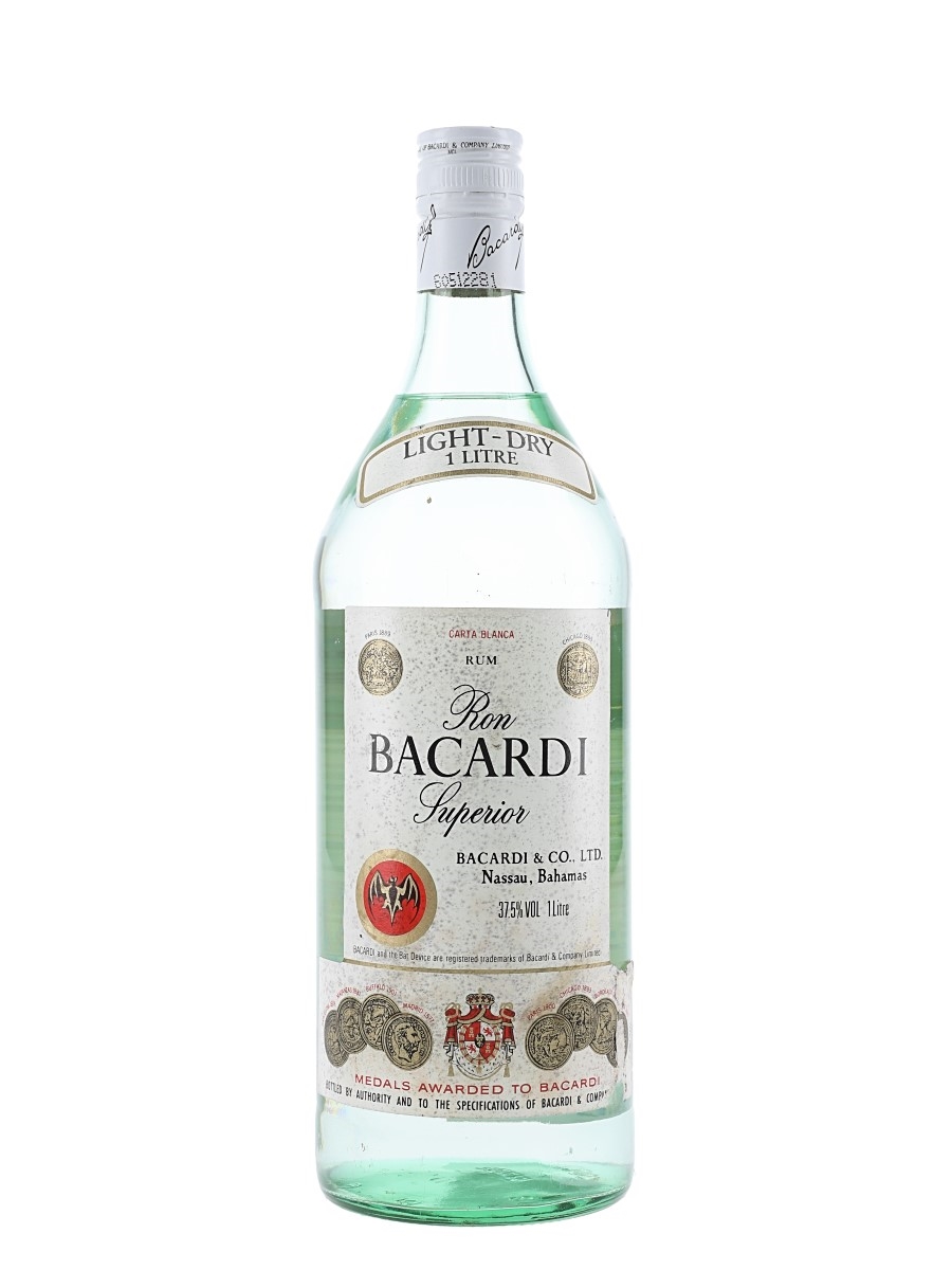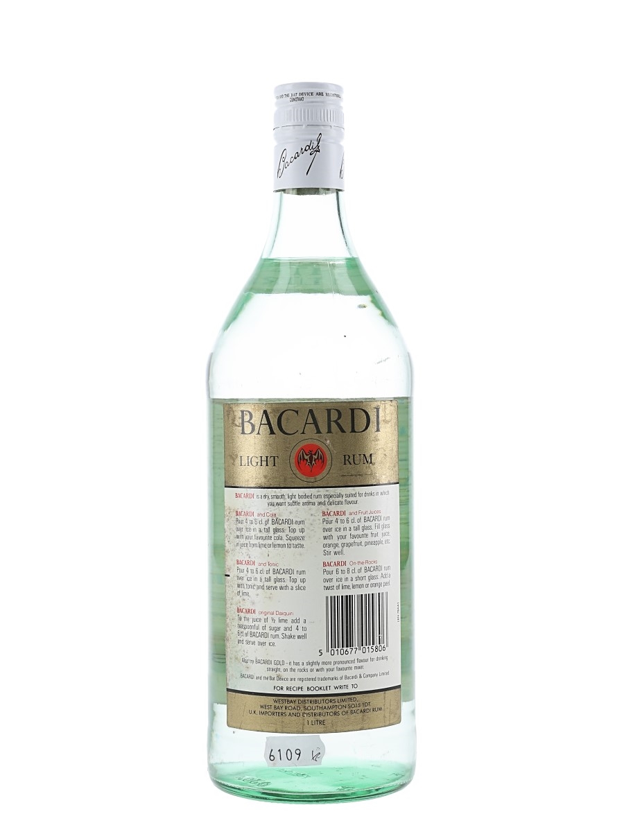A litre bottle of Bacardi Carta Blanca rum, produced in Nassau, Bahamas. We estimate this was bottled in the 1980s to 1990s.