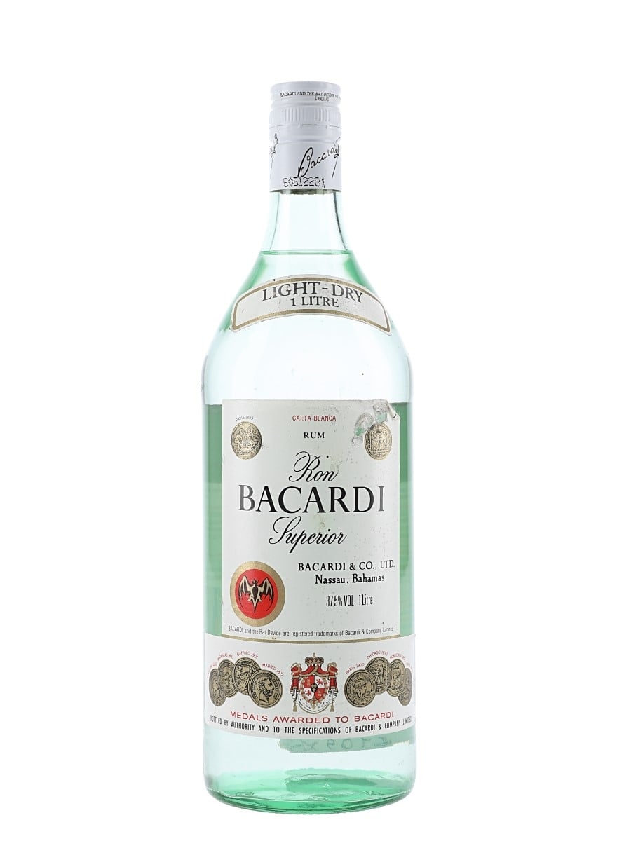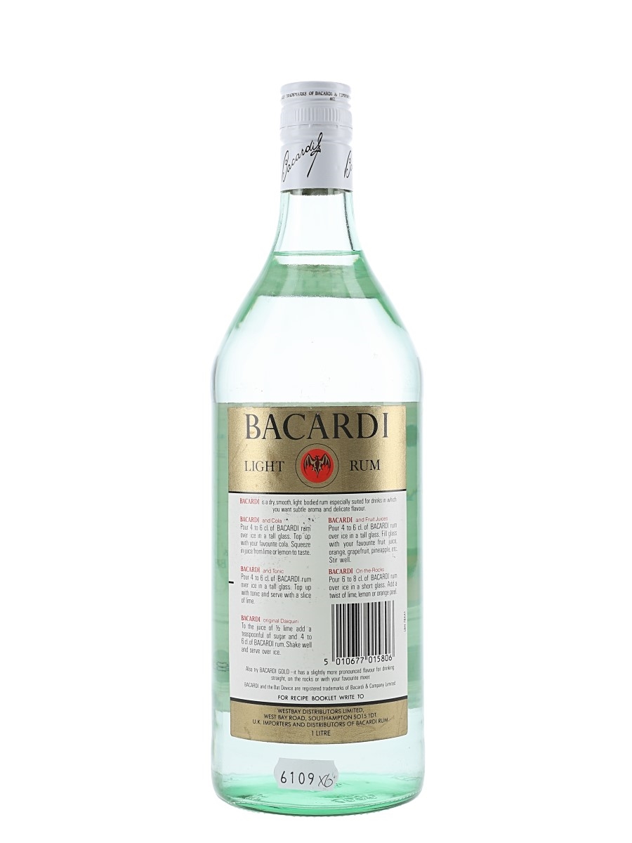 A litre bottle of Bacardi Carta Blanca rum, produced in Nassau, Bahamas. We estimate this was bottled in the 1980s to 1990s.