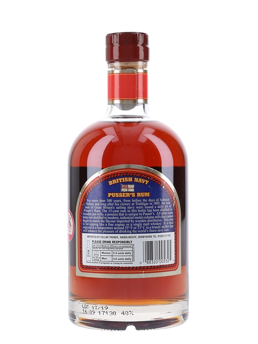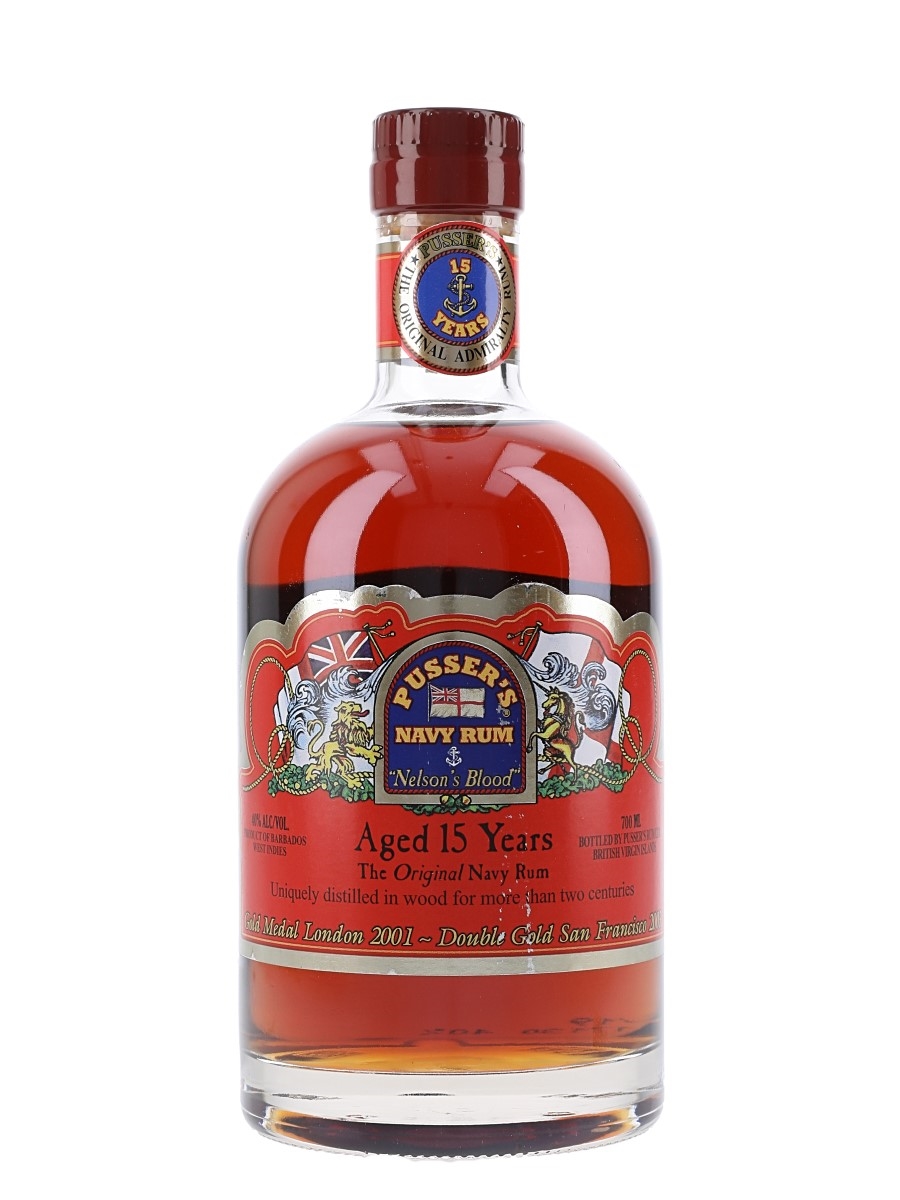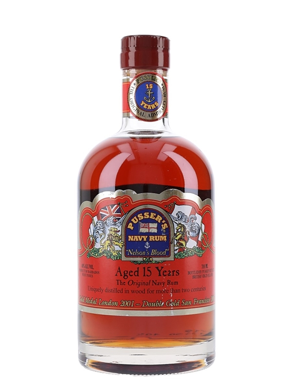 A bottle of Pusser's Navy Rum 15 Year Old, Nelson's Blood, produced in Barbados and the West Indies.