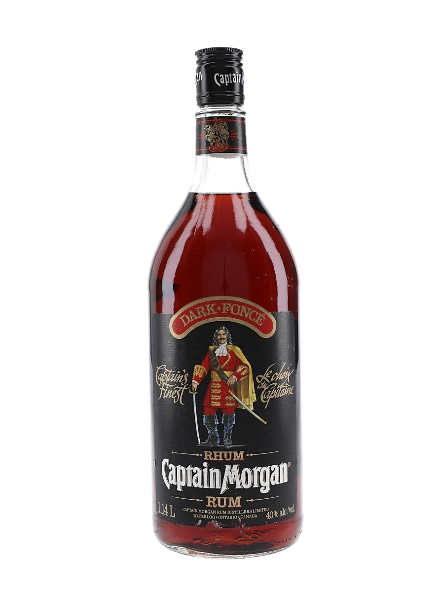 A 114cl bottle of Captain Morgan dark rum, produced by Captain Morgan rum distillers Ltd, Waterloo, Ontario, Canada.