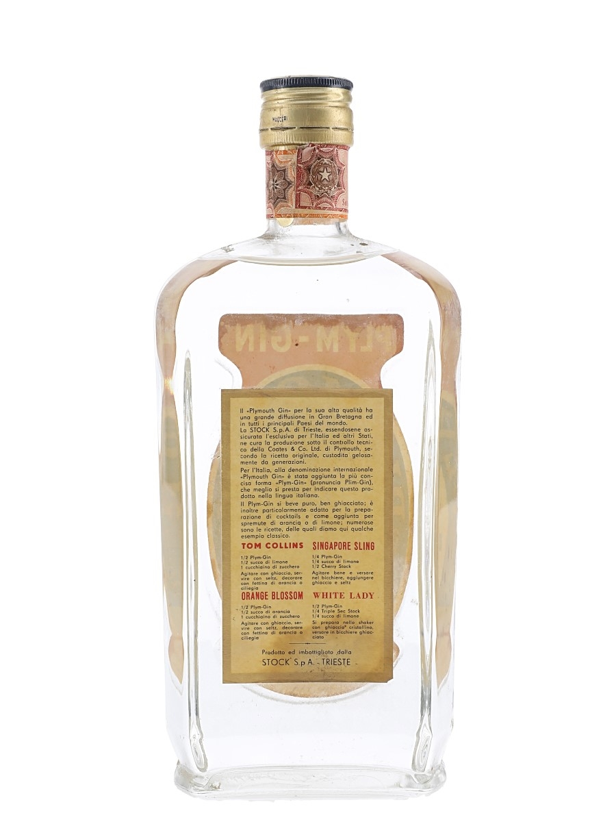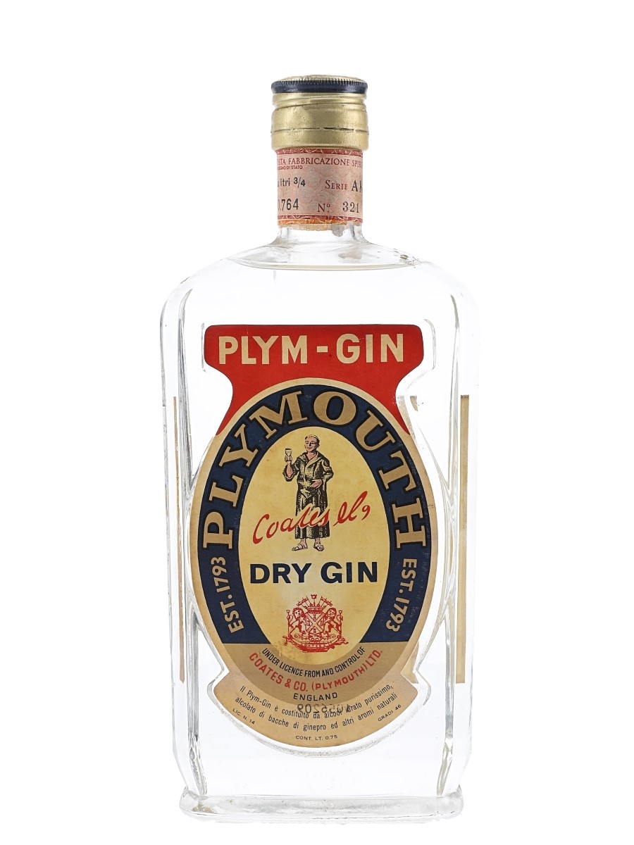 A bottle of Plym-Gin, a dry Plymouth gin. This was produced in Italy by Stock, under licence from and control of Coates & Co. We estimate this was bottled in the 1970s.