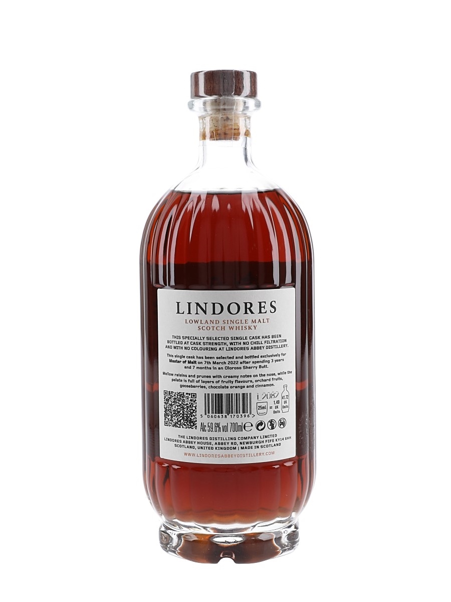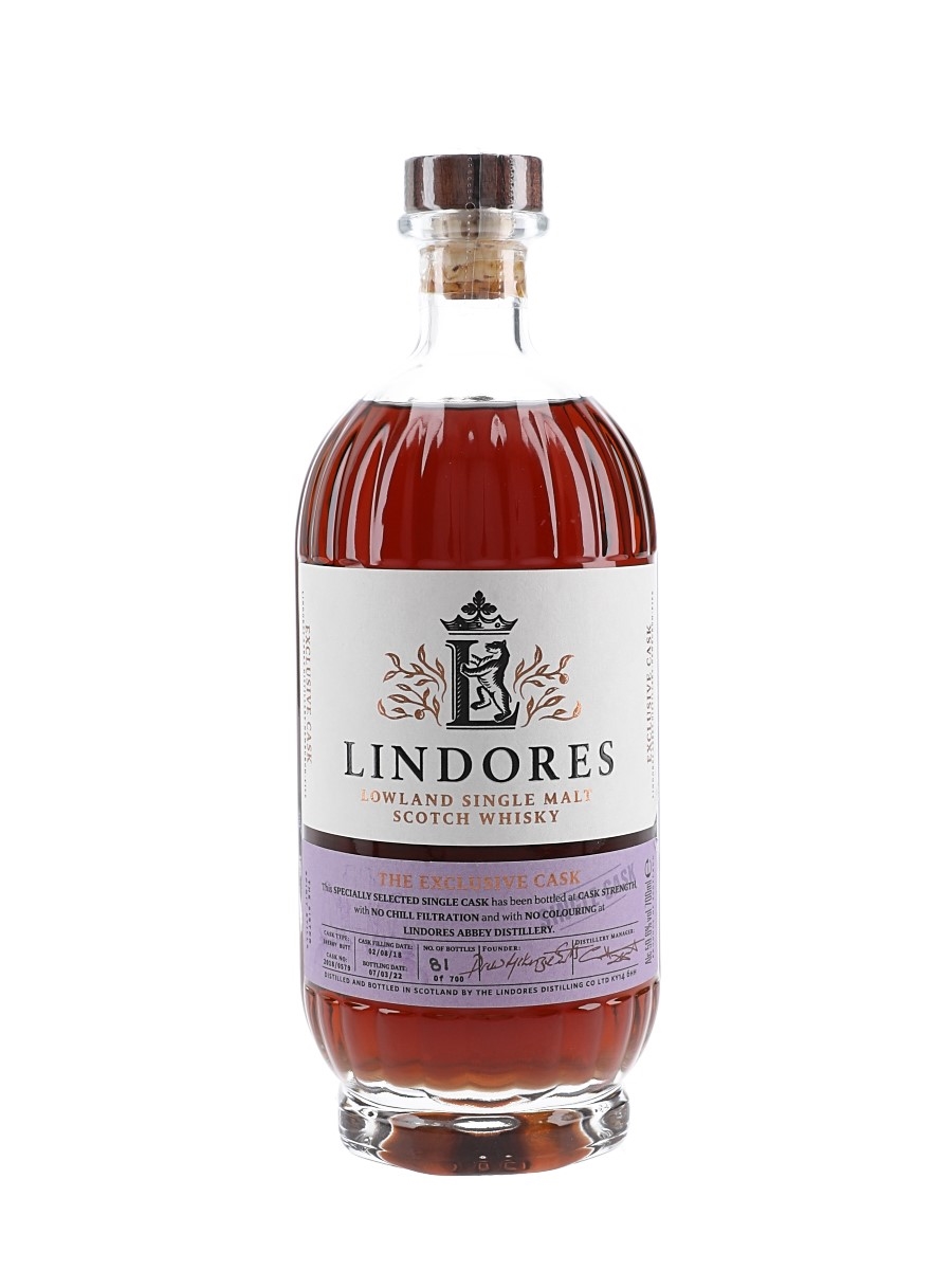A bottle of Lindores Abbey Exclusive Cask Lowland Single Malt Scotch Whisky. This was distilled on 2 August 2018, matured in a sherry Butt and bottled on 7 March 2022 at a cask strength of 59.6%.