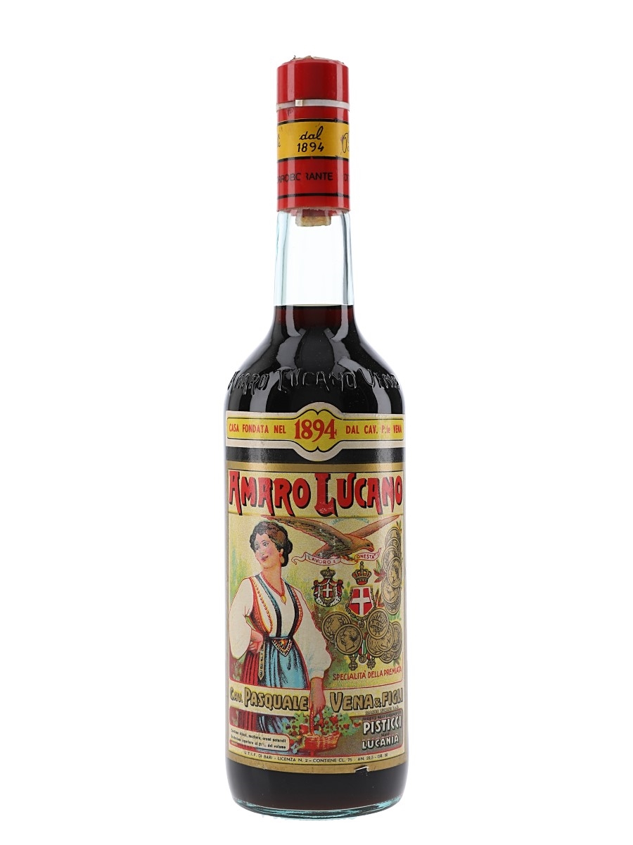 A bottle of Amaro Lucano, a bitter liqueur produced by Cav. Pasquale Vena & Figli in Pisticci, Italy. We estimate this was bottled in the 1980s.
