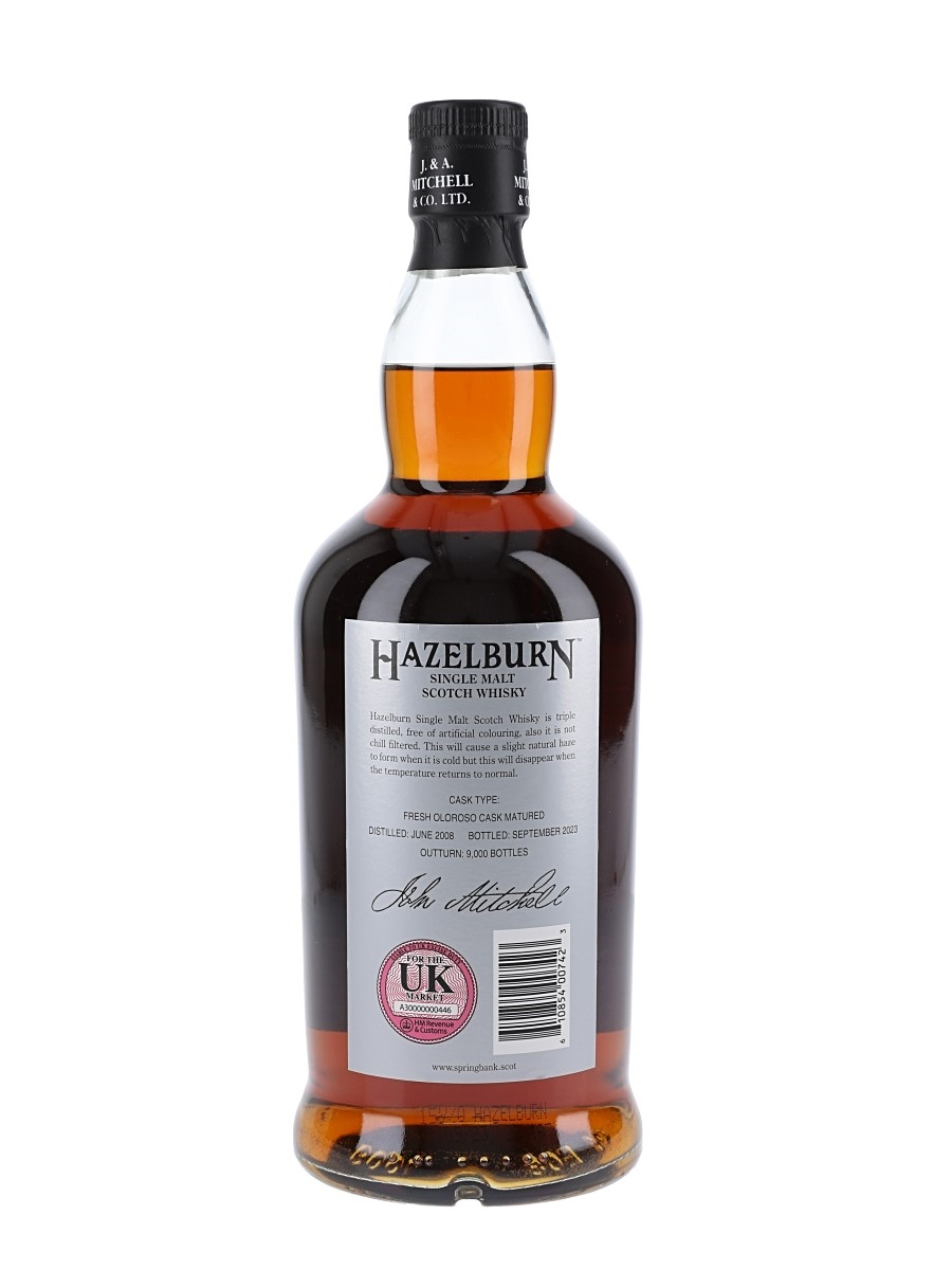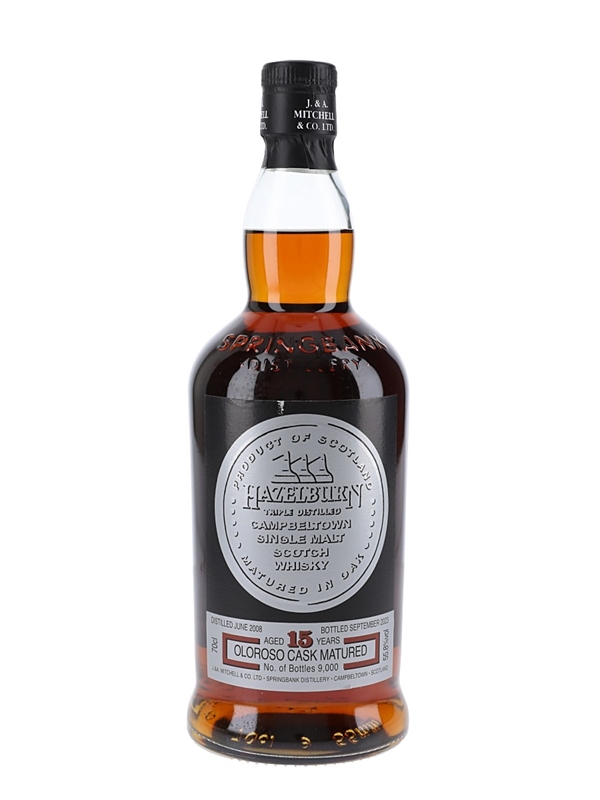 A bottle Hazelburn 15 Year Old Campbeltown Single Malt Scotch Whisky. This was triple distilled in June 2008 at Springbank distillery, matured in fresh oloroso sherry casks and bottled on 18 September 2023. This is one of 9000 bottles.