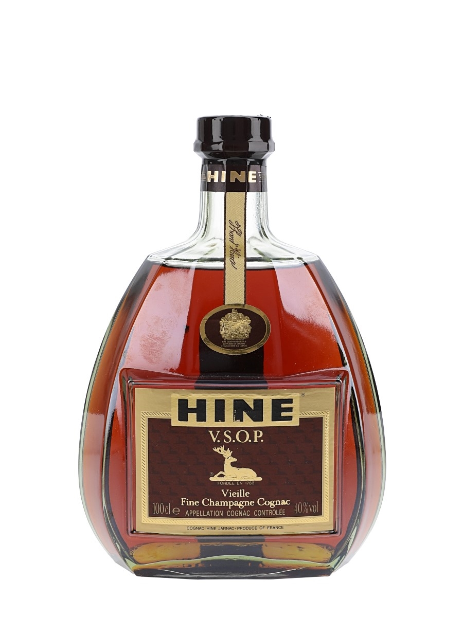 A litre bottle of Hine VSOP Vieille Fine Champagne Cognac. We estimate this was bottled in the 1980s.