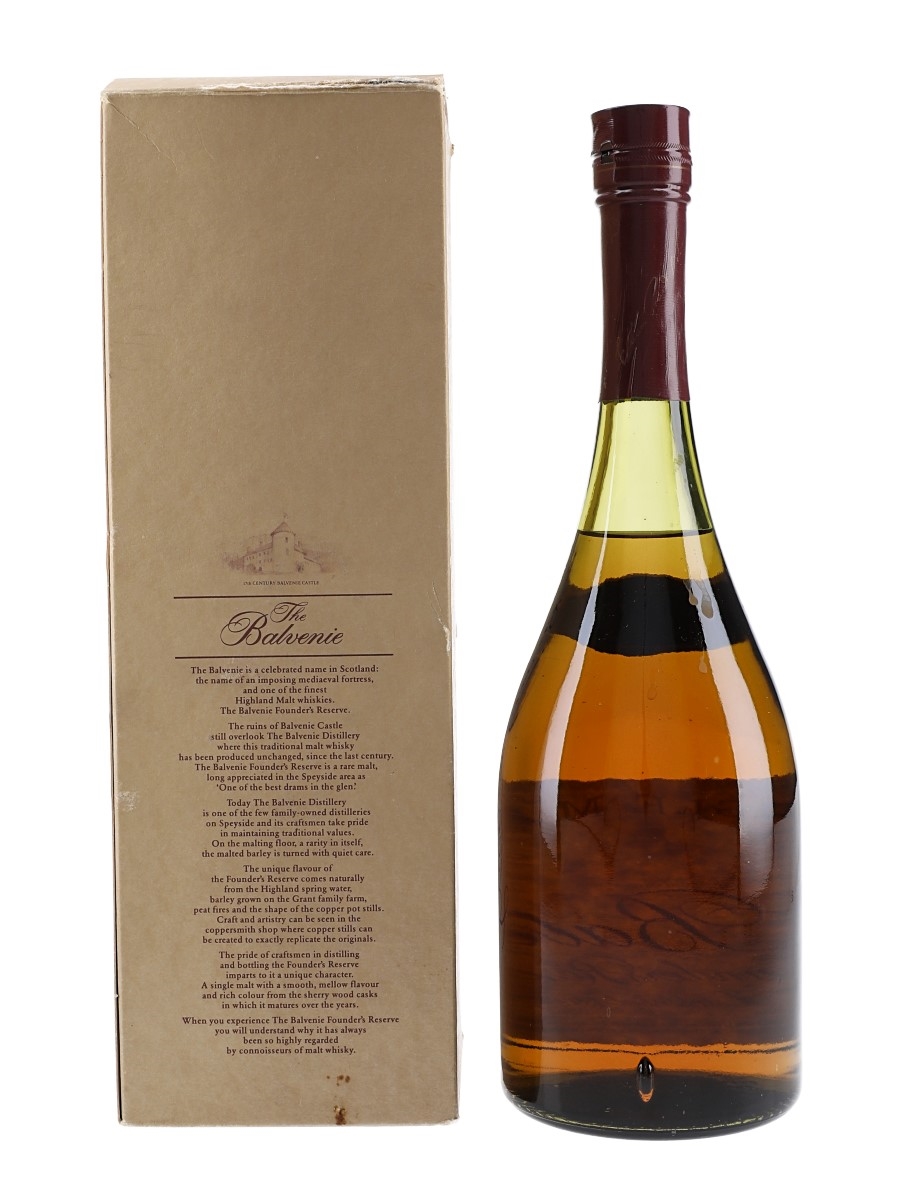 A bottle of The Balvenie Founder's Reserve Single Highland Malt Scotch Whisky produced by William Grant & Sons Ltd. We estimate this was bottled in the 1980s.