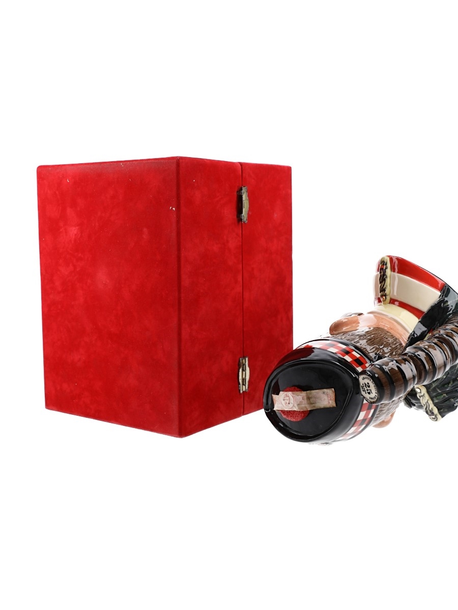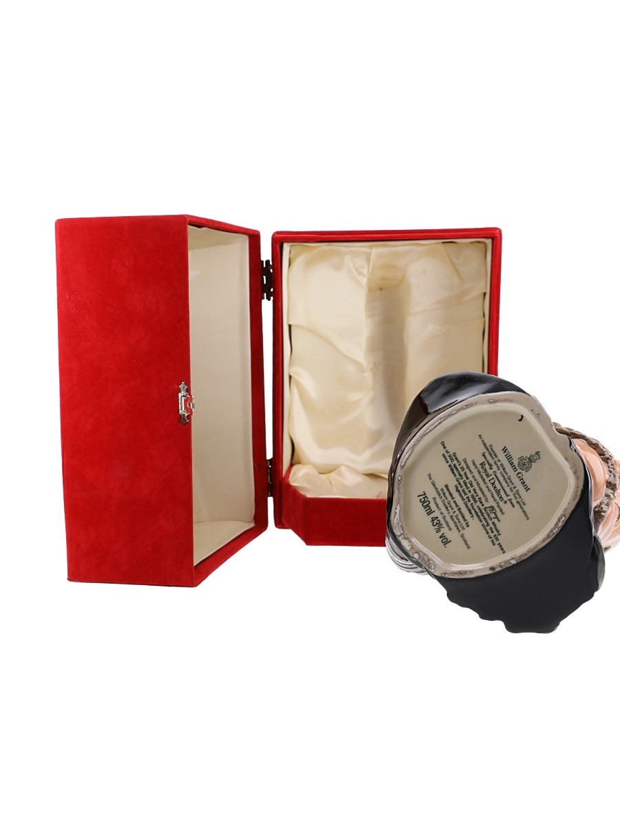 A bottle of William Grant's 25 Year Old Very Rare Scotch Whisky, presented in a ceramic William Grant Character Jug with a Scotch whisky barrel, specially commissioned from Royal Doulton handle for the 100th anniversary of the distillery. This was released in 1987.