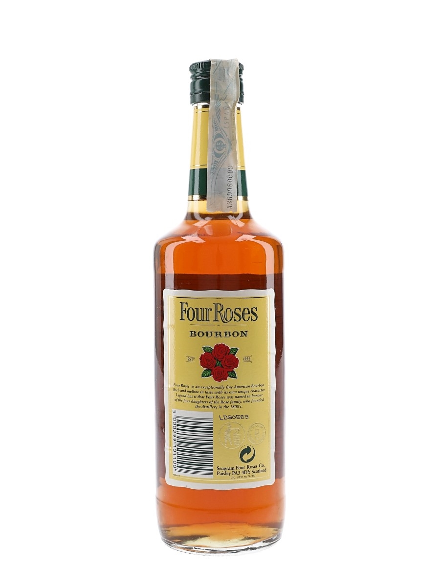 A bottle of Four Roses Kentucky Straight Bourbon Whiskey, distilled and aged in Kentucky. We estimate this was bottled in the 1990s.