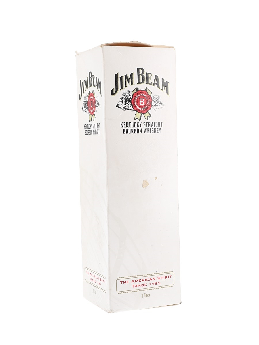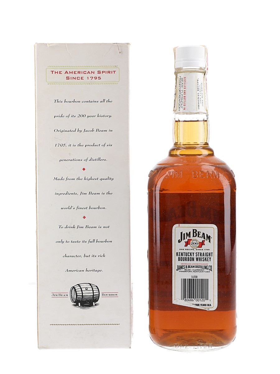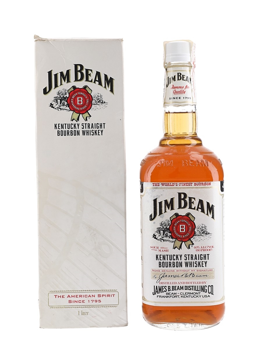 A litre bottle of Jim Beam White Label 4 Year Old Kentucky Straight Bourbon Whiskey. We estimate this was bottled in the 1990s.