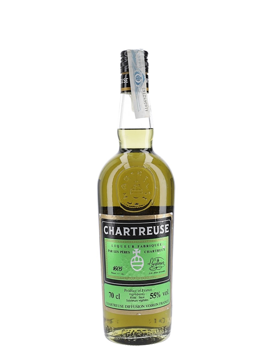 A bottle of Chartreuse Green liqueur from France. We estimate this was bottled in the early 1990s.