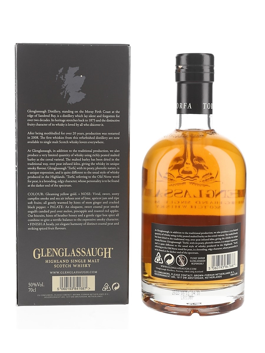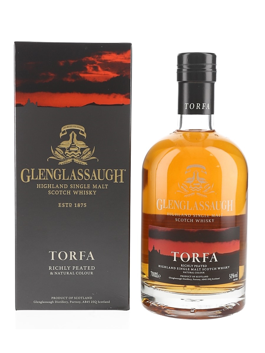 A bottle of Glenglassaugh Torfa Richly Peated Highland Single Malt Scotch Whisky.