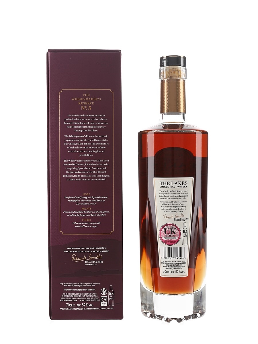 A bottle of The Lakes The Whisky Maker's Reserve No.5 English Single Malt Whisky. This was matured in a combination of Oloroso, Pedro Ximenez and red wine casks, comprising Spanish and American oak.