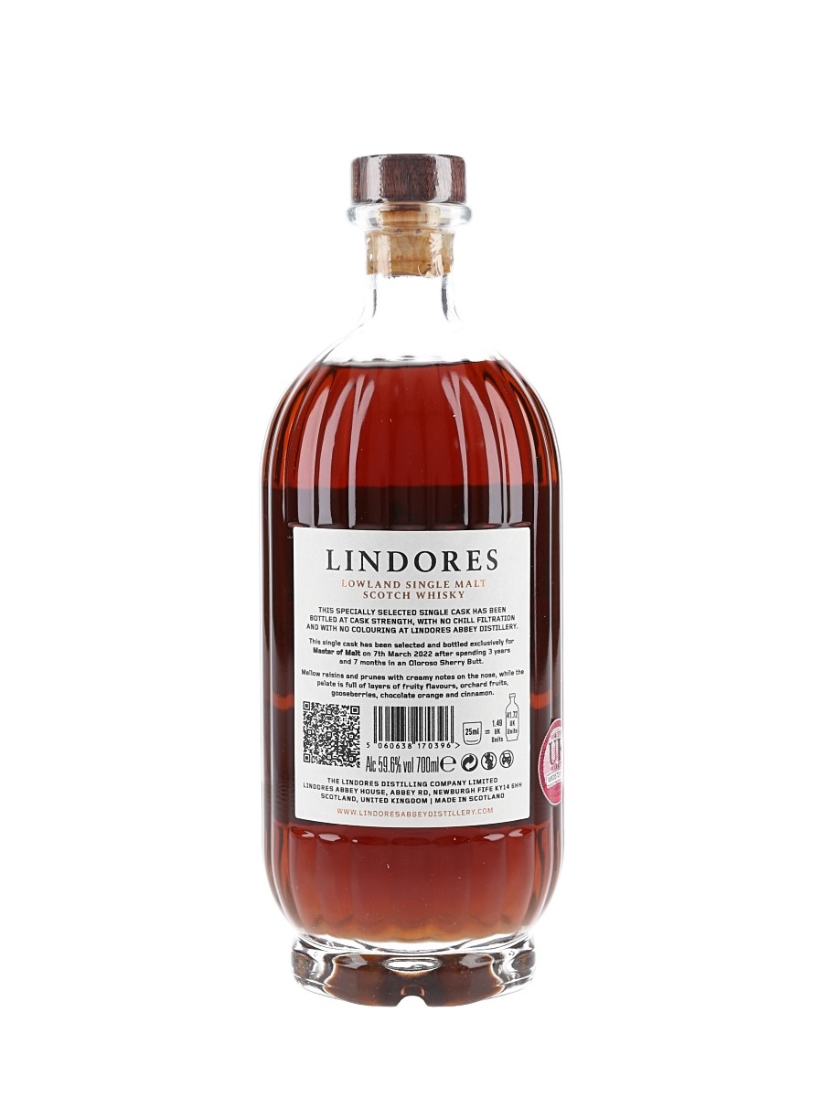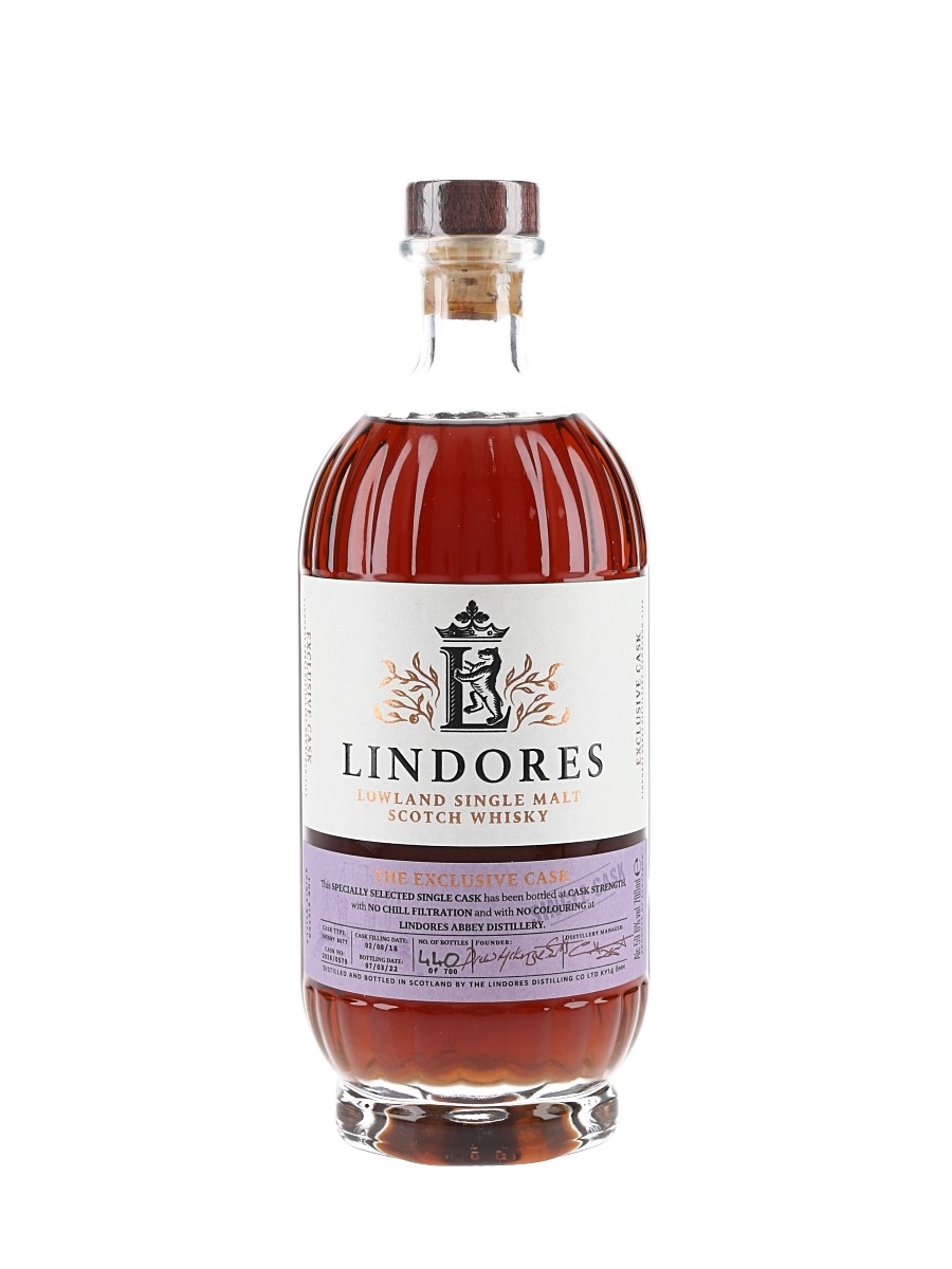A bottle of Lindores Abbey The Exclusive Cask Lowland Single Malt Scotch Whisky. This was distilled on 2 August 2018, matured in a single sherry butt and bottled on 7 March 2022 at 59.6% ABV.